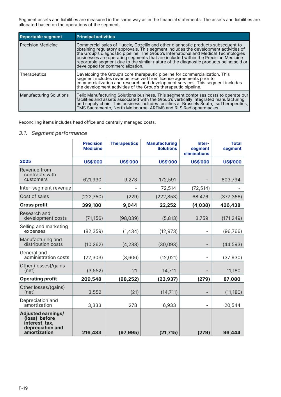 Segment assets and liabilities are measured in the same way as in the financial statements. The assets and liabilities are allocated based on the operations of the segment. Reportable segment Principal activities Precision Medicine Commercial sales of Illuccix, Gozellix and other diagnostic products subsequent to obtaining regulatory approvals. This segment includes the development activities of the Group’s diagnostic pipeline. The Group’s International and Medical Technologies businesses are operating segments that are included within the Precision Medicine reportable segment due to the similar nature of the diagnostic products being sold or developed for commercialization. Therapeutics Developing the Group’s core therapeutic pipeline for commercialization. This segment includes revenue received from license agreements prior to commercialization and research and development services. This segment includes the development activities of the Group’s therapeutic pipeline. Manufacturing Solutions Telix Manufacturing Solutions business. This segment comprises costs to operate our facilities and assets associated with the Group’s vertically integrated manufacturing and supply chain. This business includes facilities at Brussels South, IsoTherapeutics, TMS Sacramento, North Melbourne, ARTMS and RLS Radiopharmacies. Reconciling items includes head office and centrally managed costs. 3.1.   Segment performance Precision Medicine Therapeutics Manufacturing Solutions Inter- segment eliminations Total segment1. 2025 US$'000 US$'000 US$'000 US$'000 US$'000 Revenue from contracts with customers 621,930 9,273 172,591 - 803,794 Inter-segment revenue - - 72,514 (72,514) - Cost of sales (222,750) (229) (222,853) 68,476 (377,356) Gross profit 399,180 9,044 22,252 (4,038) 426,438 Research and development costs (71,156) (98,039) (5,813) 3,759 (171,249) Selling and marketing expenses (82,359) (1,434) (12,973) - (96,766) Manufacturing and distribution costs (10,262) (4,238) (30,093) - (44,593) General and administration costs (22,303) (3,606) (12,021) - (37,930) Other (losses)/gains (net) (3,552) 21 14,711 - 11,180 Operating profit 209,548 (98,252) (23,937) (279) 87,080 Other losses/(gains) (net) 3,552 (21) (14,711) - (11,180) Depreciation and amortization 3,333 278 16,933 - 20,544 Adjusted earnings/ (loss) before interest, tax, depreciation and amortization 216,433 (97,995) (21,715) (279) 96,444 F-19