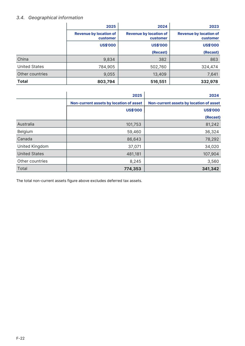 3.4.   Geographical information 2025 2024 2023 Revenue by location of customer Revenue by location of customer Revenue by location of customer US$'000 US$'000 US$'000 (Recast) (Recast) China 9,834 382 863 United States 784,905 502,760 324,474 Other countries 9,055 13,409 7,641 Total 803,794 516,551 332,978 2025 2025 2024 Non-current assets by location of asset Non-current assets by location of asset US$'000 US$'000 (Recast) Australia 101,753 81,242 Belgium 59,460 36,324 Canada 86,643 78,292 United Kingdom 37,071 34,020 United States 481,181 107,904 Other countries 8,245 3,560 Total 774,353 341,342 The total non-current assets figure above excludes deferred tax assets. F-22