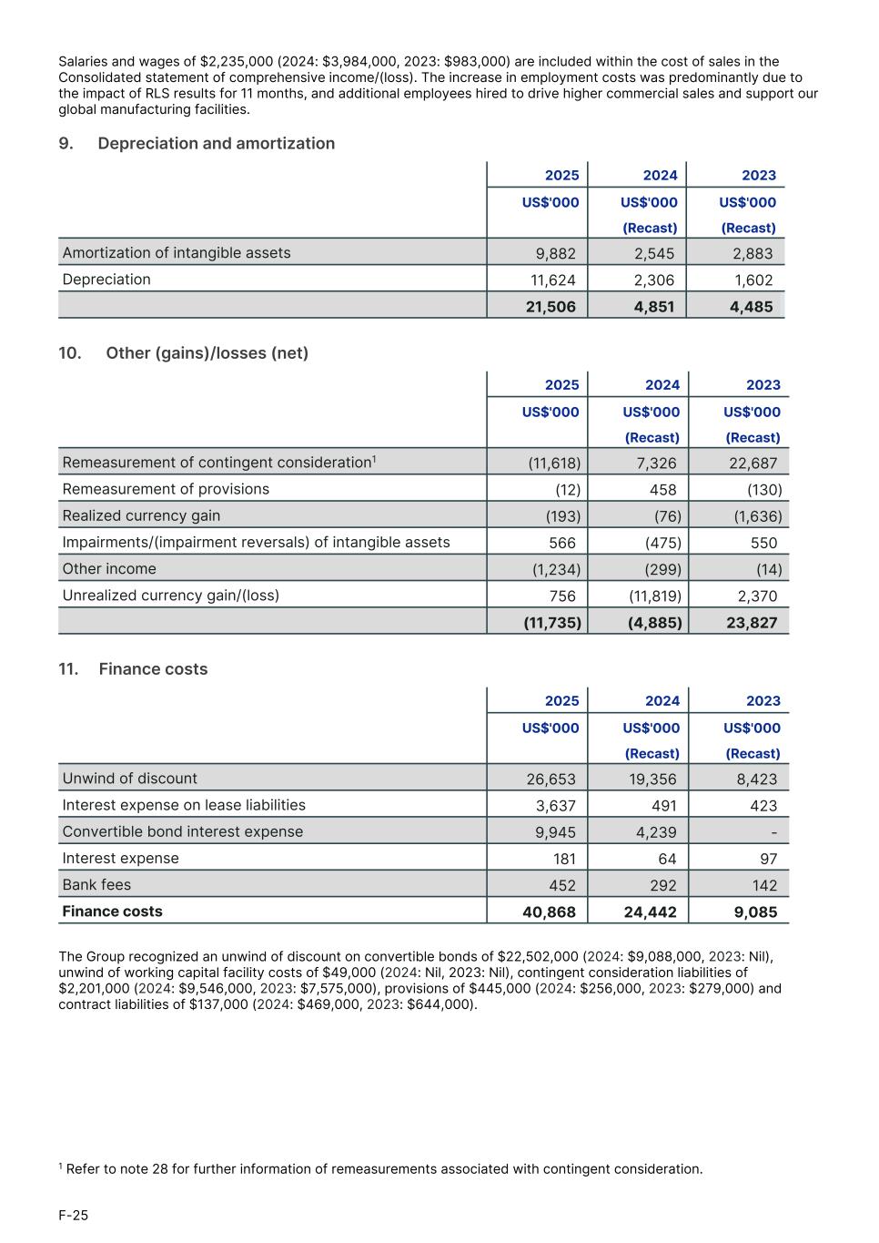 Salaries and wages of $2,235,000 (2024: $3,984,000, 2023: $983,000) are included within the cost of sales in the Consolidated statement of comprehensive income/(loss). The increase in employment costs was predominantly due to the impact of RLS results for 11 months, and additional employees hired to drive higher commercial sales and support our global manufacturing facilities. 9.      Depreciation and amortization 2025 2024 2023 US$'000 US$'000 US$'000 (Recast) (Recast) Amortization of intangible assets 9,882 2,545 2,883 Depreciation 11,624 2,306 1,602 21,506 4,851 4,485 10.      Other (gains)/losses (net) 2025 2024 2023 US$'000 US$'000 US$'000 (Recast) (Recast) Remeasurement of contingent consideration1 (11,618) 7,326 22,687 Remeasurement of provisions (12) 458 (130) Realized currency gain (193) (76) (1,636) Impairments/(impairment reversals) of intangible assets 566 (475) 550 Other income (1,234) (299) (14) Unrealized currency gain/(loss) 756 (11,819) 2,370 (11,735) (4,885) 23,827 11.     Finance costs 2025 2024 2023 US$'000 US$'000 US$'000 (Recast) (Recast) Unwind of discount 26,653 19,356 8,423 Interest expense on lease liabilities 3,637 491 423 Convertible bond interest expense 9,945 4,239 - Interest expense 181 64 97 Bank fees 452 292 142 Finance costs 40,868 24,442 9,085 The Group recognized an unwind of discount on convertible bonds of $22,502,000 (2024: $9,088,000, 2023: Nil), unwind of working capital facility costs of $49,000 (2024: Nil, 2023: Nil), contingent consideration liabilities of $2,201,000 (2024: $9,546,000, 2023: $7,575,000), provisions of $445,000 (2024: $256,000, 2023: $279,000) and contract liabilities of $137,000 (2024: $469,000, 2023: $644,000). F-25 1 Refer to note 28 for further information of remeasurements associated with contingent consideration.