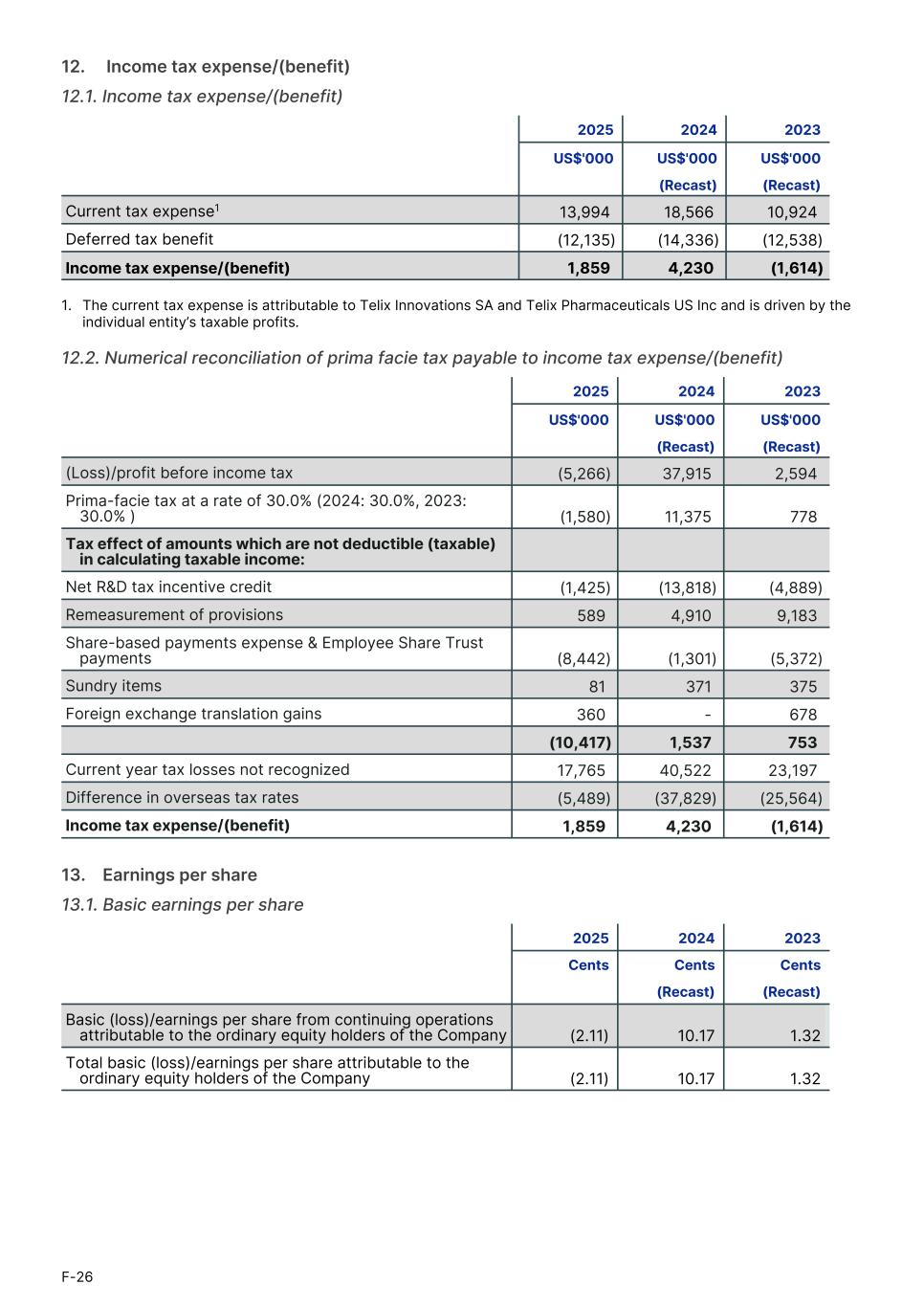 12.     Income tax expense/(benefit) 12.1. Income tax expense/(benefit) 2025 2024 2023 US$'000 US$'000 US$'000 (Recast) (Recast) Current tax expense1 13,994 18,566 10,924 Deferred tax benefit (12,135) (14,336) (12,538) Income tax expense/(benefit) 1,859 4,230 (1,614) 1. The current tax expense is attributable to Telix Innovations SA and Telix Pharmaceuticals US Inc and is driven by the individual entity’s taxable profits. 12.2. Numerical reconciliation of prima facie tax payable to income tax expense/(benefit) 2025 2024 2023 US$'000 US$'000 US$'000 (Recast) (Recast) (Loss)/profit before income tax (5,266) 37,915 2,594 Prima-facie tax at a rate of 30.0% (2024: 30.0%, 2023: 30.0% ) (1,580) 11,375 778 Tax effect of amounts which are not deductible (taxable) in calculating taxable income: Net R&D tax incentive credit (1,425) (13,818) (4,889) Remeasurement of provisions 589 4,910 9,183 Share-based payments expense & Employee Share Trust payments (8,442) (1,301) (5,372) Sundry items 81 371 375 Foreign exchange translation gains 360 - 678 (10,417) 1,537 753 Current year tax losses not recognized 17,765 40,522 23,197 Difference in overseas tax rates (5,489) (37,829) (25,564) Income tax expense/(benefit) 1,859 4,230 (1,614) 13.    Earnings per share 13.1. Basic earnings per share 2025 2024 2023 Cents Cents Cents1. (Recast) (Recast)1. Basic (loss)/earnings per share from continuing operations attributable to the ordinary equity holders of the Company (2.11) 10.17 1.32 Total basic (loss)/earnings per share attributable to the ordinary equity holders of the Company (2.11) 10.17 1.32 F-26