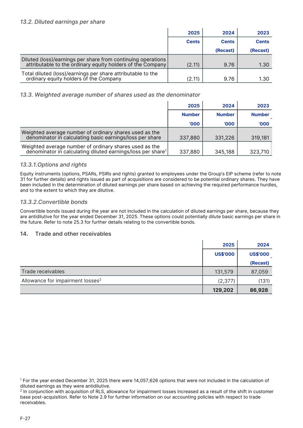 13.2. Diluted earnings per share 2025 2024 2023 Cents Cents Cents1. (Recast) (Recast)1. Diluted (loss)/earnings per share from continuing operations attributable to the ordinary equity holders of the Company (2.11) 9.76 1.30 Total diluted (loss)/earnings per share attributable to the ordinary equity holders of the Company (2.11) 9.76 1.30 13.3. Weighted average number of shares used as the denominator 2025 2024 2023 Number Number Number1. ’000 ’000 ’000 Weighted average number of ordinary shares used as the denominator in calculating basic earnings/loss per share 337,880 331,226 319,181 Weighted average number of ordinary shares used as the denominator in calculating diluted earnings/loss per share1 337,880 345,188 323,710 13.3.1.Options and rights Equity instruments (options, PSARs, PSIRs and rights) granted to employees under the Group’s EIP scheme (refer to note 31 for further details) and rights issued as part of acquisitions are considered to be potential ordinary shares. They have been included in the determination of diluted earnings per share based on achieving the required performance hurdles, and to the extent to which they are dilutive. 13.3.2.Convertible bonds Convertible bonds issued during the year are not included in the calculation of diluted earnings per share, because they are antidilutive for the year ended December 31, 2025. These options could potentially dilute basic earnings per share in the future. Refer to note 25.3 for further details relating to the convertible bonds. 14.     Trade and other receivables 2025 2024 US$'000 US$'000 (Recast) Trade receivables 131,579 87,059 Allowance for impairment losses2 (2,377) (131) 129,202 86,928 F-27 1 For the year ended December 31, 2025 there were 14,057,626 options that were not included in the calculation of diluted earnings as they were antidilutive. 2 In conjunction with acquisition of RLS, allowance for impairment losses increased as a result of the shift in customer base post-acquisition. Refer to Note 2.9 for further information on our accounting policies with respect to trade receivables.