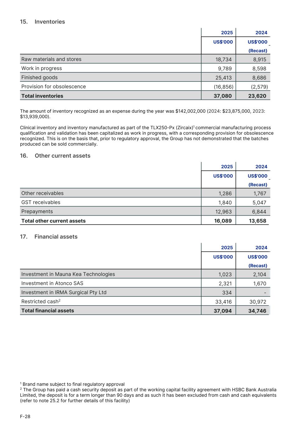 15.     Inventories 2025 2024 US$'000 US$'000 (Recast) Raw materials and stores 18,734 8,915 Work in progress 9,789 8,598 Finished goods 25,413 8,686 Provision for obsolescence (16,856) (2,579) Total inventories 37,080 23,620 The amount of inventory recognized as an expense during the year was $142,002,000 (2024: $23,875,000, 2023: $13,939,000). Clinical inventory and inventory manufactured as part of the TLX250-Px (Zircaix)1 commercial manufacturing process qualification and validation has been capitalized as work in progress, with a corresponding provision for obsolescence recognized. This is on the basis that, prior to regulatory approval, the Group has not demonstrated that the batches produced can be sold commercially. 16.     Other current assets 2025 2024 US$'000 US$'000 (Recast) Other receivables 1,286 1,767 GST receivables 1,840 5,047 Prepayments 12,963 6,844 Total other current assets 16,089 13,658 17.     Financial assets 2025 2024 US$'000 US$'000 (Recast) Investment in Mauna Kea Technologies 1,023 2,104 Investment in Atonco SAS 2,321 1,670 Investment in IRMA Surgical Pty Ltd 334 - Restricted cash2 33,416 30,972 Total financial assets 37,094 34,746 F-28 1 Brand name subject to final regulatory approval 2 The Group has paid a cash security deposit as part of the working capital facility agreement with HSBC Bank Australia Limited, the deposit is for a term longer than 90 days and as such it has been excluded from cash and cash equivalents (refer to note 25.2 for further details of this facility)