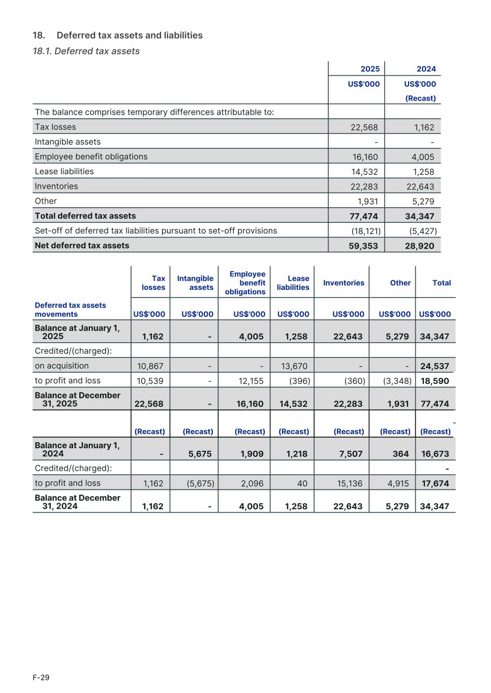 18.     Deferred tax assets and liabilities 18.1. Deferred tax assets 2025 2024 US$'000 US$'000 (Recast) The balance comprises temporary differences attributable to: Tax losses 22,568 1,162 Intangible assets - - Employee benefit obligations 16,160 4,005 Lease liabilities 14,532 1,258 Inventories 22,283 22,643 Other 1,931 5,279 Total deferred tax assets 77,474 34,347 Set-off of deferred tax liabilities pursuant to set-off provisions (18,121) (5,427) Net deferred tax assets 59,353 28,920 Tax losses Intangible assets Employee benefit obligations Lease liabilities Inventories Other Total1. Deferred tax assets movements US$'000 US$'000 US$'000 US$'000 US$'000 US$'000 US$'0001. Balance at January 1, 2025 1,162 - 4,005 1,258 22,643 5,279 34,347 Credited/(charged): on acquisition 10,867 - - 13,670 - - 24,537 to profit and loss 10,539 - 12,155 (396) (360) (3,348) 18,590 Balance at December 31, 2025 22,568 - 16,160 14,532 22,283 1,931 77,474 (Recast) (Recast) (Recast) (Recast) (Recast) (Recast) (Recast) Balance at January 1, 2024 - 5,675 1,909 1,218 7,507 364 16,673 Credited/(charged): - to profit and loss 1,162 (5,675) 2,096 40 15,136 4,915 17,674 Balance at December 31, 2024 1,162 - 4,005 1,258 22,643 5,279 34,347 F-29