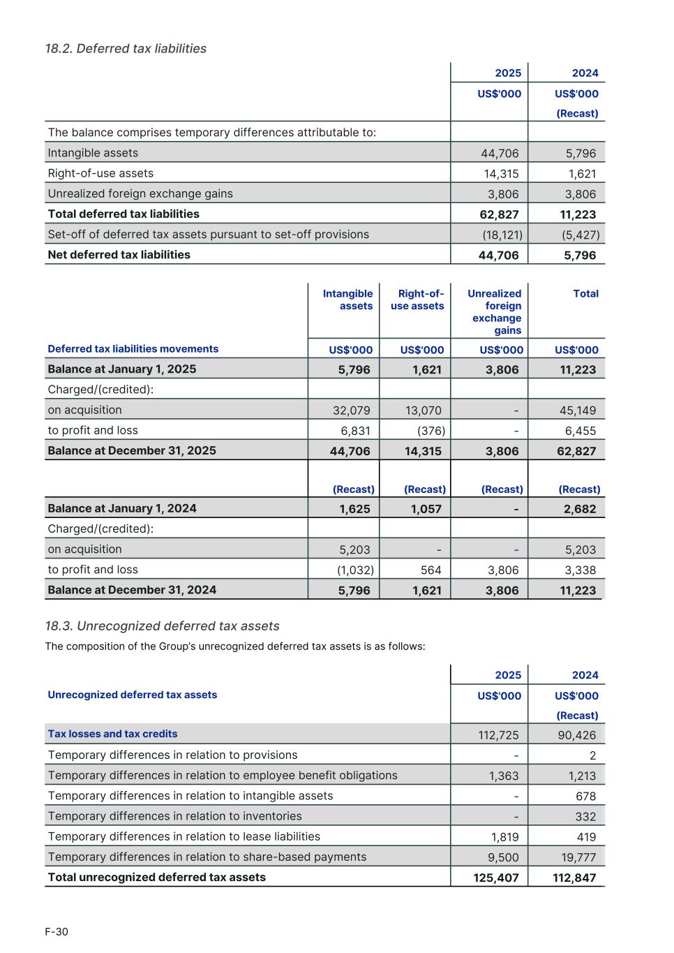 18.2. Deferred tax liabilities 2025 2024 US$'000 US$'000 (Recast) The balance comprises temporary differences attributable to: Intangible assets 44,706 5,796 Right-of-use assets 14,315 1,621 Unrealized foreign exchange gains 3,806 3,806 Total deferred tax liabilities 62,827 11,223 Set-off of deferred tax assets pursuant to set-off provisions (18,121) (5,427) Net deferred tax liabilities 44,706 5,796 Intangible assets Right-of- use assets Unrealized foreign exchange gains Total Deferred tax liabilities movements US$'000 US$'000 US$'000 US$'000 Balance at January 1, 2025 5,796 1,621 3,806 11,223 Charged/(credited): on acquisition 32,079 13,070 - 45,149 to profit and loss 6,831 (376) - 6,455 Balance at December 31, 2025 44,706 14,315 3,806 62,827 (Recast) (Recast) (Recast) (Recast) Balance at January 1, 2024 1,625 1,057 - 2,682 Charged/(credited): on acquisition 5,203 - - 5,203 to profit and loss (1,032) 564 3,806 3,338 Balance at December 31, 2024 5,796 1,621 3,806 11,223 18.3. Unrecognized deferred tax assets The composition of the Group’s unrecognized deferred tax assets is as follows: 2025 2024 Unrecognized deferred tax assets US$'000 US$'000 (Recast) Tax losses and tax credits 112,725 90,426 Temporary differences in relation to provisions - 2 Temporary differences in relation to employee benefit obligations 1,363 1,213 Temporary differences in relation to intangible assets - 678 Temporary differences in relation to inventories - 332 Temporary differences in relation to lease liabilities 1,819 419 Temporary differences in relation to share-based payments 9,500 19,777 Total unrecognized deferred tax assets 125,407 112,847 F-30