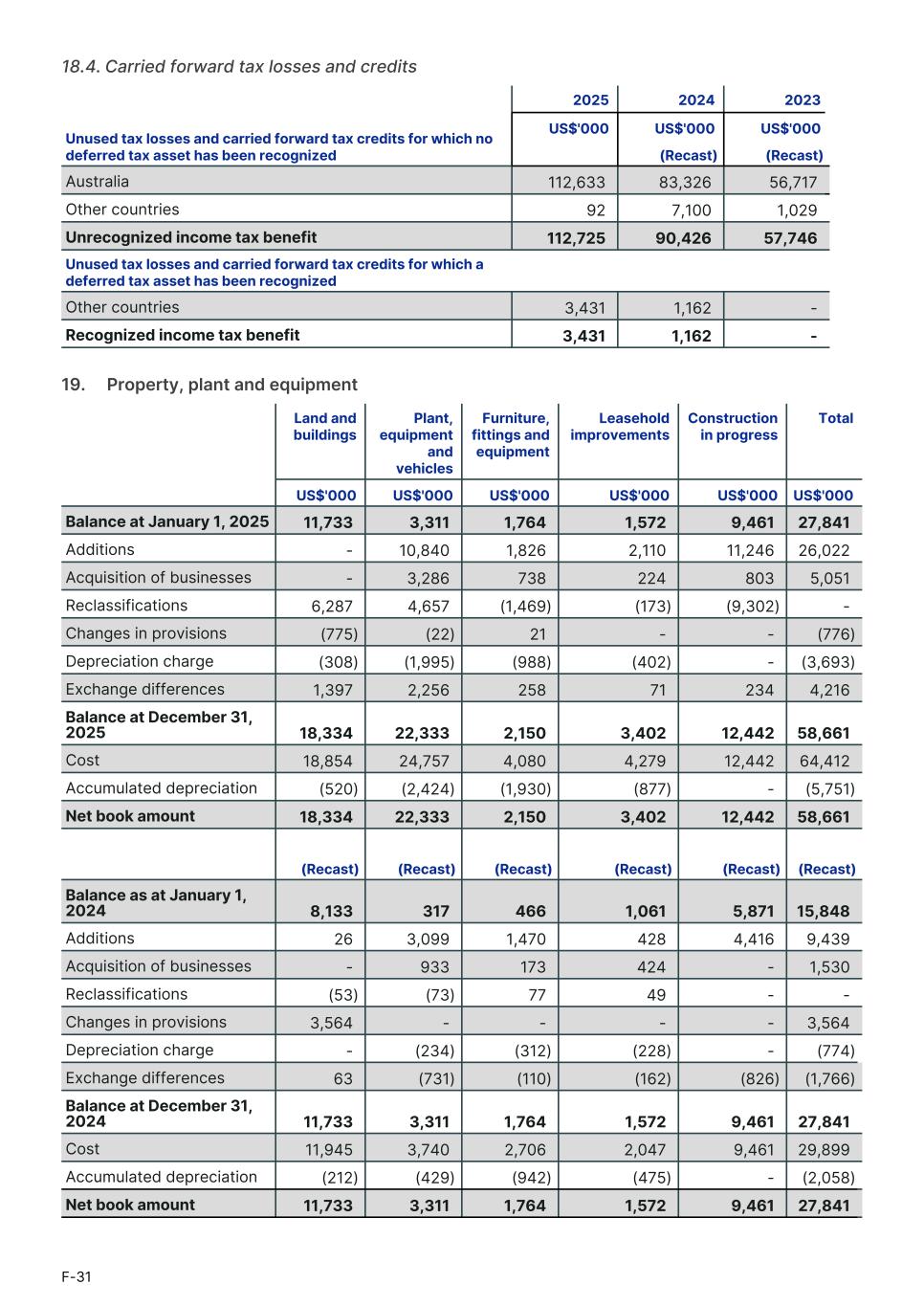 18.4. Carried forward tax losses and credits Unused tax losses and carried forward tax credits for which no deferred tax asset has been recognized 2025 2024 2023 US$'000 US$'000 US$'000 (Recast) (Recast) Australia 112,633 83,326 56,717 Other countries 92 7,100 1,029 Unrecognized income tax benefit 112,725 90,426 57,746 Unused tax losses and carried forward tax credits for which a deferred tax asset has been recognized Other countries 3,431 1,162 - Recognized income tax benefit 3,431 1,162 - 19.     Property, plant and equipment Land and buildings Plant, equipment and vehicles Furniture, fittings and equipment Leasehold improvements Construction in progress Total1. US$'000 US$'000 US$'000 US$'000 US$'000 US$'000 Balance at January 1, 2025 11,733 3,311 1,764 1,572 9,461 27,841 Additions - 10,840 1,826 2,110 11,246 26,022 Acquisition of businesses - 3,286 738 224 803 5,051 Reclassifications 6,287 4,657 (1,469) (173) (9,302) - Changes in provisions (775) (22) 21 - - (776) Depreciation charge (308) (1,995) (988) (402) - (3,693) Exchange differences 1,397 2,256 258 71 234 4,216 Balance at December 31, 2025 18,334 22,333 2,150 3,402 12,442 58,661 Cost 18,854 24,757 4,080 4,279 12,442 64,412 Accumulated depreciation (520) (2,424) (1,930) (877) - (5,751) Net book amount 18,334 22,333 2,150 3,402 12,442 58,661 (Recast) (Recast) (Recast) (Recast) (Recast) (Recast) Balance as at January 1, 2024 8,133 317 466 1,061 5,871 15,848 Additions 26 3,099 1,470 428 4,416 9,439 Acquisition of businesses - 933 173 424 - 1,530 Reclassifications (53) (73) 77 49 - - Changes in provisions 3,564 - - - - 3,564 Depreciation charge - (234) (312) (228) - (774) Exchange differences 63 (731) (110) (162) (826) (1,766) Balance at December 31, 2024 11,733 3,311 1,764 1,572 9,461 27,841 Cost 11,945 3,740 2,706 2,047 9,461 29,899 Accumulated depreciation (212) (429) (942) (475) - (2,058) Net book amount 11,733 3,311 1,764 1,572 9,461 27,841 F-31