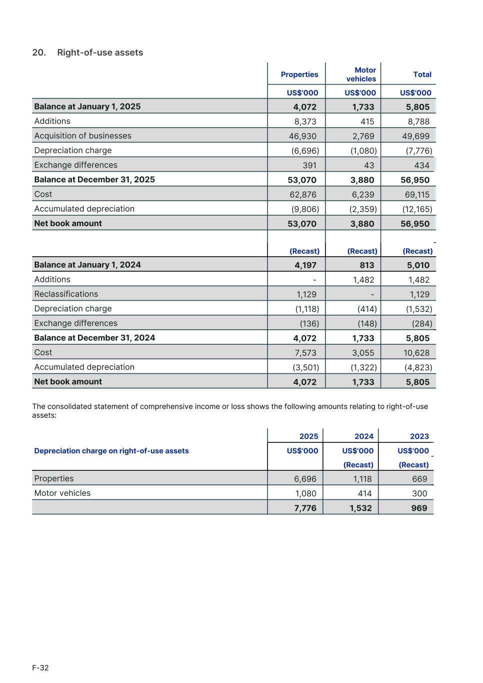20.     Right-of-use assets Properties Motor vehicles Total1. US$'000 US$'000 US$'000 Balance at January 1, 2025 4,072 1,733 5,805 Additions 8,373 415 8,788 Acquisition of businesses 46,930 2,769 49,699 Depreciation charge (6,696) (1,080) (7,776) Exchange differences 391 43 434 Balance at December 31, 2025 53,070 3,880 56,950 Cost 62,876 6,239 69,115 Accumulated depreciation (9,806) (2,359) (12,165) Net book amount 53,070 3,880 56,950 (Recast) (Recast) (Recast) Balance at January 1, 2024 4,197 813 5,010 Additions - 1,482 1,482 Reclassifications 1,129 - 1,129 Depreciation charge (1,118) (414) (1,532) Exchange differences (136) (148) (284) Balance at December 31, 2024 4,072 1,733 5,805 Cost 7,573 3,055 10,628 Accumulated depreciation (3,501) (1,322) (4,823) Net book amount 4,072 1,733 5,805 The consolidated statement of comprehensive income or loss shows the following amounts relating to right-of-use assets: 2025 2024 2023 Depreciation charge on right-of-use assets US$'000 US$'000 US$'000 (Recast) (Recast) Properties 6,696 1,118 669 Motor vehicles 1,080 414 300 7,776 1,532 969 F-32