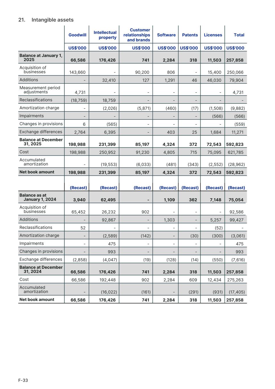 21.     Intangible assets Goodwill Intellectual property Customer relationships and brands Software Patents Licenses Total1. US$'000 US$'000 US$'000 US$'000 US$'000 US$'000 US$'0001. Balance at January 1, 2025 66,586 176,426 741 2,284 318 11,503 257,858 Acquisition of businesses 143,660 - 90,200 806 - 15,400 250,066 Additions - 32,410 127 1,291 46 46,030 79,904 Measurement period adjustments 4,731 - - - - - 4,731 Reclassifications (18,759) 18,759 - - - - - Amortization charge - (2,026) (5,871) (460) (17) (1,508) (9,882) Impairments - - - - - (566) (566) Changes in provisions 6 (565) - - - - (559) Exchange differences 2,764 6,395 - 403 25 1,684 11,271 Balance at December 31, 2025 198,988 231,399 85,197 4,324 372 72,543 592,823 Cost 198,988 250,952 91,230 4,805 715 75,095 621,785 Accumulated amortization - (19,553) (6,033) (481) (343) (2,552) (28,962) Net book amount 198,988 231,399 85,197 4,324 372 72,543 592,823 (Recast) (Recast) (Recast) (Recast) (Recast) (Recast) (Recast) Balance as at January 1, 2024 3,940 62,495 - 1,109 362 7,148 75,054 Acquisition of businesses 65,452 26,232 902 - - - 92,586 Additions - 92,867 - 1,303 - 5,257 99,427 Reclassifications 52 - - - - (52) - Amortization charge - (2,589) (142) - (30) (300) (3,061) Impairments - 475 - - - - 475 Changes in provisions - 993 - - - - 993 Exchange differences (2,858) (4,047) (19) (128) (14) (550) (7,616) Balance at December 31, 2024 66,586 176,426 741 2,284 318 11,503 257,858 Cost 66,586 192,448 902 2,284 609 12,434 275,263 Accumulated amortization - (16,022) (161) - (291) (931) (17,405) Net book amount 66,586 176,426 741 2,284 318 11,503 257,858 F-33