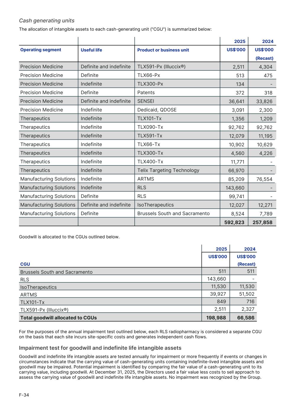 Cash generating units The allocation of intangible assets to each cash-generating unit ("CGU") is summarized below: 2025 2024 Operating segment Useful life Product or business unit US$'000 US$'000 1. (Recast) 1. Precision Medicine Definite and indefinite TLX591-Px (Illuccix®) 2,511 4,304 Precision Medicine Definite TLX66-Px 513 475 Precision Medicine Indefinite TLX300-Px 134 - Precision Medicine Definite Patents 372 318 Precision Medicine Definite and indefinite SENSEI 36,641 33,826 Precision Medicine Indefinite Dedicaid, QDOSE 3,091 2,300 Therapeutics Indefinite TLX101-Tx 1,356 1,209 Therapeutics Indefinite TLX090-Tx 92,762 92,762 Therapeutics Indefinite TLX591-Tx 12,079 11,195 Therapeutics Indefinite TLX66-Tx 10,902 10,629 Therapeutics Indefinite TLX300-Tx 4,560 4,226 Therapeutics Indefinite TLX400-Tx 11,771 - Therapeutics Indefinite Telix Targeting Technology 66,970 - Manufacturing Solutions Indefinite ARTMS 85,209 76,554 Manufacturing Solutions Indefinite RLS 143,660 - Manufacturing Solutions Definite RLS 99,741 - Manufacturing Solutions Definite and indefinite IsoTherapeutics 12,027 12,271 Manufacturing Solutions Definite Brussels South and Sacramento 8,524 7,789 592,823 257,858 Goodwill is allocated to the CGUs outlined below. 2025 2024 US$'000 US$'000 CGU 1. (Recast) Brussels South and Sacramento 511 511 RLS 143,660 - IsoTherapeutics 11,530 11,530 ARTMS 39,927 51,502 TLX101-Tx 849 716 TLX591-Px (Illuccix®) 2,511 2,327 Total goodwill allocated to CGUs 198,988 66,586 For the purposes of the annual impairment test outlined below, each RLS radiopharmacy is considered a separate CGU on the basis that each site incurs site-specific costs and generates independent cash flows. Impairment test for goodwill and indefinite life intangible assets Goodwill and indefinite life intangible assets are tested annually for impairment or more frequently if events or changes in circumstances indicate that the carrying value of cash-generating units containing indefinite-lived intangible assets and goodwill may be impaired. Potential impairment is identified by comparing the fair value of a cash-generating unit to its carrying value, including goodwill. At December 31, 2025, the Directors used a fair value less costs to sell approach to assess the carrying value of goodwill and indefinite life intangible assets. No impairment was recognized by the Group. F-34