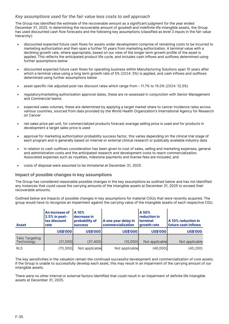 Key assumptions used for the fair value less costs to sell approach The Group has identified the estimate of the recoverable amount as a significant judgment for the year ended December 31, 2025. In determining the recoverable amount of goodwill and indefinite life intangible assets, the Group has used discounted cash flow forecasts and the following key assumptions (classified as level 3 inputs in the fair value hierarchy): • discounted expected future cash flows for assets under development comprise of remaining costs to be incurred to marketing authorization and then span a further 10 years from marketing authorization. A terminal value with a declining growth rate, where appropriate, based on our view of the longer term growth profile of the asset is applied. This reflects the anticipated product life cycle, and includes cash inflows and outflows determined using further assumptions below • discounted expected future cash flows for operating business within Manufacturing Solutions span 10 years after which a terminal value using a long term growth rate of 5% (2024: 5%) is applied, and cash inflows and outflows determined using further assumptions below • asset specific risk adjusted post-tax discount rates which range from – 11.7% to 15.0% (2024: 12.5%) • regulatory/marketing authorization approval dates, these are re-assessed in conjunction with Senior Management and Commercial teams • expected sales volumes, these are determined by applying a target market share to cancer incidence rates across various countries, sourced from data provided by the World Health Organization’s International Agency for Research on Cancer • net sales price per unit, for commercialized products forecast average selling price is used and for products in development a target sales price is used • approval for marketing authorization probability success factor, this varies depending on the clinical trial stage of each program and is generally based on internal or external clinical research or publically available industry data • in relation to cash outflows consideration has been given to cost of sales, selling and marketing expenses, general and administration costs and the anticipated research and development costs to reach commercialization. Associated expenses such as royalties, milestone payments and license fees are included, and • costs of disposal were assumed to be immaterial at December 31, 2025. Impact of possible changes in key assumptions The Group has considered reasonable possible changes in the key assumptions as outlined below and has not identified any instances that could cause the carrying amounts of the intangible assets at December 31, 2025 to exceed their recoverable amounts. Outlined below are impacts of possible changes in key assumptions for material CGUs that were recently acquired. The group would have to recognize an impairment against the carrying value of the intangible assets of each respective CGU. Asset An increase of 2.5% in post- tax discount rate A 10% decrease in probability of success A one year delay in commercialization A 50% reduction in terminal growth rate A 10% reduction in future cash inflows US$'000 US$'000 US$'000 US$'000 US$'000 Telix Targeting Technology (21,500) (37,400) (10,000) Not applicable Not applicable RLS (70,300) Not applicable Not applicable (46,000) (45,200) The key sensitivities in the valuation remain the continued successful development and commercialization of core assets. If the Group is unable to successfully develop each asset, this may result in an impairment of the carrying amount of our intangible assets. There were no other internal or external factors identified that could result in an impairment of definite life intangible assets at December 31, 2025. F-35