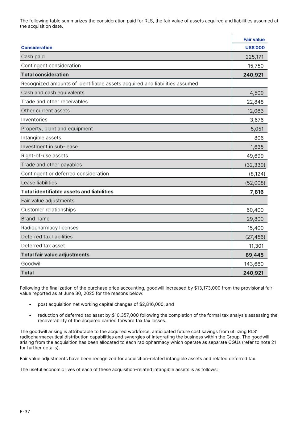 The following table summarizes the consideration paid for RLS, the fair value of assets acquired and liabilities assumed at the acquisition date. Fair value Consideration US$'0001. Cash paid 225,171 Contingent consideration 15,750 Total consideration 240,921 Recognized amounts of identifiable assets acquired and liabilities assumed Cash and cash equivalents 4,509 Trade and other receivables 22,848 Other current assets 12,063 Inventories 3,676 Property, plant and equipment 5,051 Intangible assets 806 Investment in sub-lease 1,635 Right-of-use assets 49,699 Trade and other payables (32,339) Contingent or deferred consideration (8,124) Lease liabilities (52,008) Total identifiable assets and liabilities 7,816 Fair value adjustments Customer relationships 60,400 Brand name 29,800 Radiopharmacy licenses 15,400 Deferred tax liabilities (27,456) Deferred tax asset 11,301 Total fair value adjustments 89,445 Goodwill 143,660 Total 240,921 Following the finalization of the purchase price accounting, goodwill increased by $13,173,000 from the provisional fair value reported as at June 30, 2025 for the reasons below: • post acquisition net working capital changes of $2,816,000, and • reduction of deferred tax asset by $10,357,000 following the completion of the formal tax analysis assessing the recoverability of the acquired carried forward tax tax losses. The goodwill arising is attributable to the acquired workforce, anticipated future cost savings from utilizing RLS' radiopharmaceutical distribution capabilities and synergies of integrating the business within the Group. The goodwill arising from the acquisition has been allocated to each radiopharmacy which operate as separate CGUs (refer to note 21 for further details). Fair value adjustments have been recognized for acquisition-related intangible assets and related deferred tax. The useful economic lives of each of these acquisition-related intangible assets is as follows: F-37