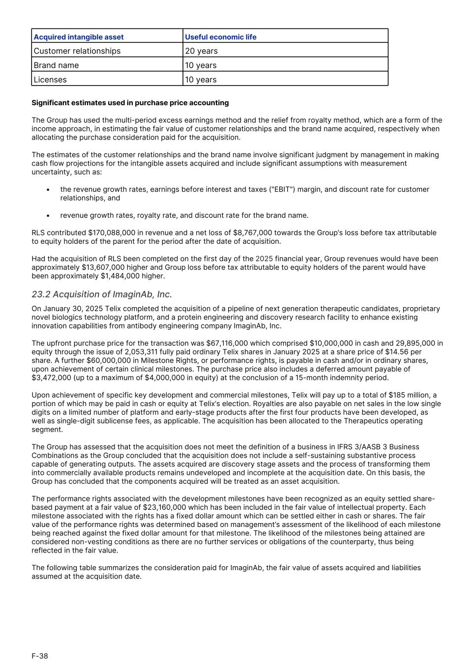 Acquired intangible asset Useful economic life Customer relationships 20 years Brand name 10 years Licenses 10 years Significant estimates used in purchase price accounting The Group has used the multi-period excess earnings method and the relief from royalty method, which are a form of the income approach, in estimating the fair value of customer relationships and the brand name acquired, respectively when allocating the purchase consideration paid for the acquisition. The estimates of the customer relationships and the brand name involve significant judgment by management in making cash flow projections for the intangible assets acquired and include significant assumptions with measurement uncertainty, such as: • the revenue growth rates, earnings before interest and taxes ("EBIT") margin, and discount rate for customer relationships, and • revenue growth rates, royalty rate, and discount rate for the brand name. RLS contributed $170,088,000 in revenue and a net loss of $8,767,000 towards the Group’s loss before tax attributable to equity holders of the parent for the period after the date of acquisition. Had the acquisition of RLS been completed on the first day of the 2025 financial year, Group revenues would have been approximately $13,607,000 higher and Group loss before tax attributable to equity holders of the parent would have been approximately $1,484,000 higher. 23.2 Acquisition of ImaginAb, Inc. On January 30, 2025 Telix completed the acquisition of a pipeline of next generation therapeutic candidates, proprietary novel biologics technology platform, and a protein engineering and discovery research facility to enhance existing innovation capabilities from antibody engineering company ImaginAb, Inc. The upfront purchase price for the transaction was $67,116,000 which comprised $10,000,000 in cash and 29,895,000 in equity through the issue of 2,053,311 fully paid ordinary Telix shares in January 2025 at a share price of $14.56 per share. A further $60,000,000 in Milestone Rights, or performance rights, is payable in cash and/or in ordinary shares, upon achievement of certain clinical milestones. The purchase price also includes a deferred amount payable of $3,472,000 (up to a maximum of $4,000,000 in equity) at the conclusion of a 15-month indemnity period. Upon achievement of specific key development and commercial milestones, Telix will pay up to a total of $185 million, a portion of which may be paid in cash or equity at Telix’s election. Royalties are also payable on net sales in the low single digits on a limited number of platform and early-stage products after the first four products have been developed, as well as single-digit sublicense fees, as applicable. The acquisition has been allocated to the Therapeutics operating segment. The Group has assessed that the acquisition does not meet the definition of a business in IFRS 3/AASB 3 Business Combinations as the Group concluded that the acquisition does not include a self-sustaining substantive process capable of generating outputs. The assets acquired are discovery stage assets and the process of transforming them into commercially available products remains undeveloped and incomplete at the acquisition date. On this basis, the Group has concluded that the components acquired will be treated as an asset acquisition. The performance rights associated with the development milestones have been recognized as an equity settled share- based payment at a fair value of $23,160,000 which has been included in the fair value of intellectual property. Each milestone associated with the rights has a fixed dollar amount which can be settled either in cash or shares. The fair value of the performance rights was determined based on management’s assessment of the likelihood of each milestone being reached against the fixed dollar amount for that milestone. The likelihood of the milestones being attained are considered non-vesting conditions as there are no further services or obligations of the counterparty, thus being reflected in the fair value. The following table summarizes the consideration paid for ImaginAb, the fair value of assets acquired and liabilities assumed at the acquisition date. F-38