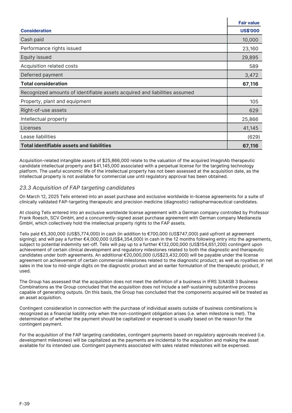 Fair value Consideration US$'0001. Cash paid 10,000 Performance rights issued 23,160 Equity issued 29,895 Acquisition related costs 589 Deferred payment 3,472 Total consideration 67,116 Recognized amounts of identifiable assets acquired and liabilities assumed Property, plant and equipment 105 Right-of-use assets 629 Intellectual property 25,866 Licenses 41,145 Lease liabilities (629) Total identifiable assets and liabilities 67,116 Acquisition-related intangible assets of $25,866,000 relate to the valuation of the acquired ImaginAb therapeutic candidate intellectual property and $41,145,000 associated with a perpetual license for the targeting technology platform. The useful economic life of the intellectual property has not been assessed at the acquisition date, as the intellectual property is not available for commercial use until regulatory approval has been obtained. 23.3 Acquisition of FAP targeting candidates On March 12, 2025 Telix entered into an asset purchase and exclusive worldwide in-license agreements for a suite of clinically validated FAP-targeting therapeutic and precision medicine (diagnostic) radiopharmaceutical candidates. At closing Telix entered into an exclusive worldwide license agreement with a German company controlled by Professor Frank Roesch, SCV GmbH, and a concurrently-signed asset purchase agreement with German company Medianezia GmbH, which collectively hold the intellectual property rights to the FAP assets. Telix paid €5,300,000 (US$5,774,000) in cash (in addition to €700,000 (US$747,000) paid upfront at agreement signing); and will pay a further €4,000,000 (US$4,354,000) in cash in the 12 months following entry into the agreements, subject to potential indemnity set-off. Telix will pay up to a further €132,000,000 (US$154,651,200) contingent upon achievement of certain clinical development and regulatory milestones related to both the diagnostic and therapeutic candidates under both agreements. An additional €20,000,000 (US$23,432,000) will be payable under the license agreement on achievement of certain commercial milestones related to the diagnostic product; as well as royalties on net sales in the low to mid-single digits on the diagnostic product and an earlier formulation of the therapeutic product, if used. The Group has assessed that the acquisition does not meet the definition of a business in IFRS 3/AASB 3 Business Combinations as the Group concluded that the acquisition does not include a self-sustaining substantive process capable of generating outputs. On this basis, the Group has concluded that the components acquired will be treated as an asset acquisition. Contingent consideration in connection with the purchase of individual assets outside of business combinations is recognized as a financial liability only when the non-contingent obligation arises (i.e. when milestone is met). The determination of whether the payment should be capitalized or expensed is usually based on the reason for the contingent payment. For the acquisition of the FAP targeting candidates, contingent payments based on regulatory approvals received (i.e. development milestones) will be capitalized as the payments are incidental to the acquisition and making the asset available for its intended use. Contingent payments associated with sales related milestones will be expensed. F-39