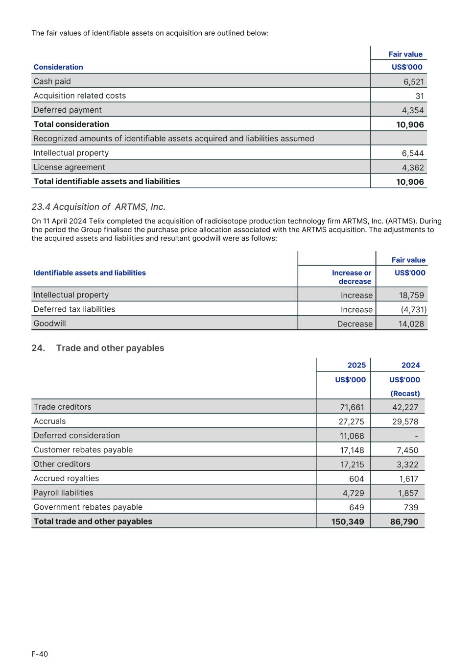 The fair values of identifiable assets on acquisition are outlined below: Fair value Consideration US$'0001. Cash paid 6,521 Acquisition related costs 31 Deferred payment 4,354 Total consideration 10,906 Recognized amounts of identifiable assets acquired and liabilities assumed Intellectual property 6,544 License agreement 4,362 Total identifiable assets and liabilities 10,906 23.4 Acquisition of ARTMS, Inc. On 11 April 2024 Telix completed the acquisition of radioisotope production technology firm ARTMS, Inc. (ARTMS). During the period the Group finalised the purchase price allocation associated with the ARTMS acquisition. The adjustments to the acquired assets and liabilities and resultant goodwill were as follows: Fair value Identifiable assets and liabilities Increase or decrease US$'000 Intellectual property Increase 18,759 Deferred tax liabilities Increase (4,731) Goodwill Decrease 14,028 24.     Trade and other payables 2025 2024 US$'000 US$'000 (Recast) Trade creditors 71,661 42,227 Accruals 27,275 29,578 Deferred consideration 11,068 - Customer rebates payable 17,148 7,450 Other creditors 17,215 3,322 Accrued royalties 604 1,617 Payroll liabilities 4,729 1,857 Government rebates payable 649 739 Total trade and other payables 150,349 86,790 F-40