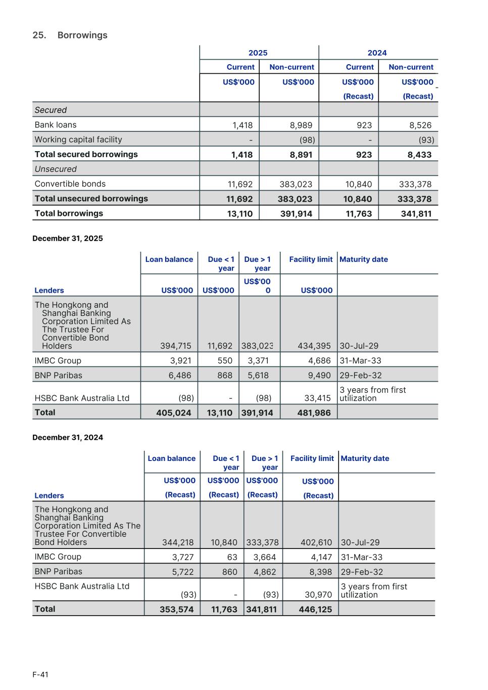 25.     Borrowings 2025 2024 Current Non-current Current Non-current1. US$'000 US$'000 US$'000 US$'0001. (Recast) (Recast)1. Secured Bank loans 1,418 8,989 923 8,526 Working capital facility - (98) - (93) Total secured borrowings 1,418 8,891 923 8,433 Unsecured Convertible bonds 11,692 383,023 10,840 333,378 Total unsecured borrowings 11,692 383,023 10,840 333,378 Total borrowings 13,110 391,914 11,763 341,811 December 31, 2025 Loan balance Due < 1 year Due > 1 year Facility limit Maturity date 1. Lenders US$'000 US$'000 US$'00 0 US$'000 1. The Hongkong and Shanghai Banking Corporation Limited As The Trustee For Convertible Bond Holders 394,715 11,692 383,023 434,395 30-Jul-29 IMBC Group 3,921 550 3,371 4,686 31-Mar-33 BNP Paribas 6,486 868 5,618 9,490 29-Feb-32 HSBC Bank Australia Ltd (98) - (98) 33,415 3 years from first utilization Total 405,024 13,110 391,914 481,986 December 31, 2024 Loan balance Due < 1 year Due > 1 year Facility limit Maturity date 1. US$'000 US$'000 US$'000 US$'000 1. Lenders (Recast) (Recast) (Recast) (Recast) 1. The Hongkong and Shanghai Banking Corporation Limited As The Trustee For Convertible Bond Holders 344,218 10,840 333,378 402,610 30-Jul-29 IMBC Group 3,727 63 3,664 4,147 31-Mar-33 BNP Paribas 5,722 860 4,862 8,398 29-Feb-32 HSBC Bank Australia Ltd (93) - (93) 30,970 3 years from first utilization Total 353,574 11,763 341,811 446,125 F-41