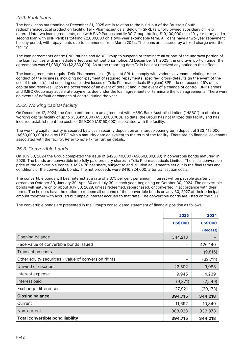 25.1. Bank loans The bank loans outstanding at December 31, 2025 are in relation to the build-out of the Brussels South radiopharmaceutical production facility. Telix Pharmaceuticals (Belgium) SPRL (a wholly owned subsidiary of Telix) entered into two loan agreements, one with BNP Paribas and IMBC Group totaling €10,100,000 on a 10-year term, and a second loan with BNP Paribas totaling €2,000,000 on a two-year extendable term. All loans have a two-year repayment holiday period, with repayments due to commence from March 2024. The loans are secured by a fixed charge over the facility. The loan agreements entitle BNP Paribas and IMBC Group to suspend or terminate all or part of the undrawn portion of the loan facilities with immediate effect and without prior notice. At December 31, 2025, the undrawn portion under the agreements was €1,989,000 ($2,330,000). As at the reporting date Telix has not received any notice to this effect. The loan agreements require Telix Pharmaceuticals (Belgium) SRL to comply with various covenants relating to the conduct of the business, including non-payment of required repayments, specified cross-defaults (in the event of the use of trade bills) and ensuring cumulative losses of Telix Pharmaceuticals (Belgium) SPRL do not exceed 25% of its capital and reserves. Upon the occurrence of an event of default and in the event of a change of control, BNP Paribas and IMBC Group may accelerate payments due under the loan agreements or terminate the loan agreements. There were no events of default or changes of control during the year. 25.2. Working capital facility On December 17, 2024, the Group entered into an agreement with HSBC Bank Australia Limited ("HSBC") to obtain a working capital facility of up to $33,415,000 (A$50,000,000). To date, the Group has not utilized this facility and has incurred establishment fee costs of $99,000 (A$150,000) associated with the facility. The working capital facility is secured by a cash security deposit on an interest-bearing term deposit of $33,415,000 (A$50,000,000) held by HSBC with a maturity date equivalent to the term of the facility. There are no financial covenants associated with the facility. Refer to note 17 for further details. 25.3. Convertible bonds On July 30, 2024 the Group completed the issue of $426,140,000 (A$650,000,000) in convertible bonds maturing in 2029. The bonds are convertible into fully paid ordinary shares in Telix Pharmaceuticals Limited. The initial conversion price of the convertible bonds is A$24.78 per share, subject to anti-dilution adjustments set out in the final terms and conditions of the convertible bonds. The net proceeds were $416,324,000, after transaction costs. The convertible bonds will bear interest at a rate of 2.375 per cent per annum. Interest will be payable quarterly in arrears on October 30, January 30, April 30 and July 30 in each year, beginning on October 30, 2024. The convertible bonds will mature on or about July 30, 2029, unless redeemed, repurchased, or converted in accordance with their terms. The holders have the option to redeem all or some of the convertible bonds on July 30, 2027 at their principal amount together with accrued but unpaid interest accrued to that date. The convertible bonds are listed on the SGX. The convertible bonds are presented in the Group’s consolidated statement of financial position as follows: 2025 20241. US$'000 US$'0001. (Recast) Opening balance 344,218 - Face value of convertible bonds issued - 426,140 Transaction costs - (9,816) Other equity securities - value of conversion rights - (62,711) Unwind of discount 22,502 9,088 Interest expense 9,945 4,239 Interest paid (9,871) (2,549) Exchange differences 27,921 (20,173) Closing balance 394,715 344,218 Current 11,692 10,840 Non-current 383,023 333,378 Total convertible bond liability 394,715 344,218 F-42