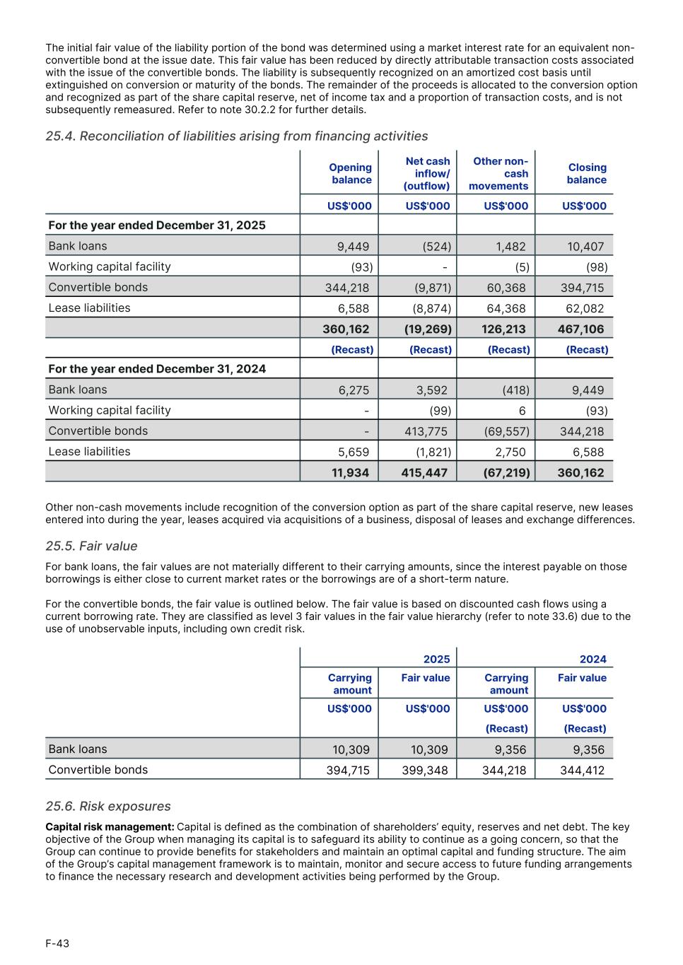The initial fair value of the liability portion of the bond was determined using a market interest rate for an equivalent non- convertible bond at the issue date. This fair value has been reduced by directly attributable transaction costs associated with the issue of the convertible bonds. The liability is subsequently recognized on an amortized cost basis until extinguished on conversion or maturity of the bonds. The remainder of the proceeds is allocated to the conversion option and recognized as part of the share capital reserve, net of income tax and a proportion of transaction costs, and is not subsequently remeasured. Refer to note 30.2.2 for further details. 25.4. Reconciliation of liabilities arising from financing activities Opening balance Net cash inflow/ (outflow) Other non- cash movements Closing balance1. US$'000 US$'000 US$'000 US$'0001. For the year ended December 31, 2025 Bank loans 9,449 (524) 1,482 10,407 Working capital facility (93) - (5) (98) Convertible bonds 344,218 (9,871) 60,368 394,715 Lease liabilities 6,588 (8,874) 64,368 62,082 360,162 (19,269) 126,213 467,106 (Recast) (Recast) (Recast) (Recast) For the year ended December 31, 2024 Bank loans 6,275 3,592 (418) 9,449 Working capital facility - (99) 6 (93) Convertible bonds - 413,775 (69,557) 344,218 Lease liabilities 5,659 (1,821) 2,750 6,588 11,934 415,447 (67,219) 360,162 Other non-cash movements include recognition of the conversion option as part of the share capital reserve, new leases entered into during the year, leases acquired via acquisitions of a business, disposal of leases and exchange differences. 25.5. Fair value For bank loans, the fair values are not materially different to their carrying amounts, since the interest payable on those borrowings is either close to current market rates or the borrowings are of a short-term nature. For the convertible bonds, the fair value is outlined below. The fair value is based on discounted cash flows using a current borrowing rate. They are classified as level 3 fair values in the fair value hierarchy (refer to note 33.6) due to the use of unobservable inputs, including own credit risk. 2025 2024 1. Carrying amount Fair value Carrying amount Fair value1. US$'000 US$'000 US$'000 US$'0001. (Recast) (Recast)1. Bank loans 10,309 10,309 9,356 9,356 Convertible bonds 394,715 399,348 344,218 344,412 25.6. Risk exposures Capital risk management: Capital is defined as the combination of shareholders’ equity, reserves and net debt. The key objective of the Group when managing its capital is to safeguard its ability to continue as a going concern, so that the Group can continue to provide benefits for stakeholders and maintain an optimal capital and funding structure. The aim of the Group’s capital management framework is to maintain, monitor and secure access to future funding arrangements to finance the necessary research and development activities being performed by the Group. F-43