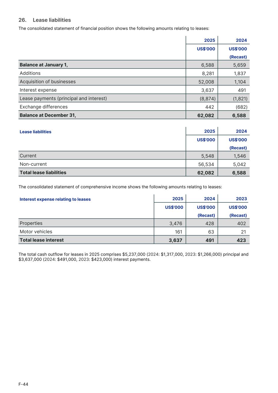 26.     Lease liabilities The consolidated statement of financial position shows the following amounts relating to leases: 2025 2024 US$'000 US$'000 (Recast) Balance at January 1, 6,588 5,659 Additions 8,281 1,837 Acquisition of businesses 52,008 1,104 Interest expense 3,637 491 Lease payments (principal and interest) (8,874) (1,821) Exchange differences 442 (682) Balance at December 31, 62,082 6,588 Lease liabilities 2025 20241. US$'000 US$'0001. (Recast)1. Current 5,548 1,546 Non-current 56,534 5,042 Total lease liabilities 62,082 6,588 The consolidated statement of comprehensive income shows the following amounts relating to leases: Interest expense relating to leases 2025 2024 2023 US$'000 US$'000 US$'000 (Recast) (Recast)1. Properties 3,476 428 402 Motor vehicles 161 63 21 Total lease interest 3,637 491 423 The total cash outflow for leases in 2025 comprises $5,237,000 (2024: $1,317,000, 2023: $1,266,000) principal and $3,637,000 (2024: $491,000, 2023: $423,000) interest payments. F-44
