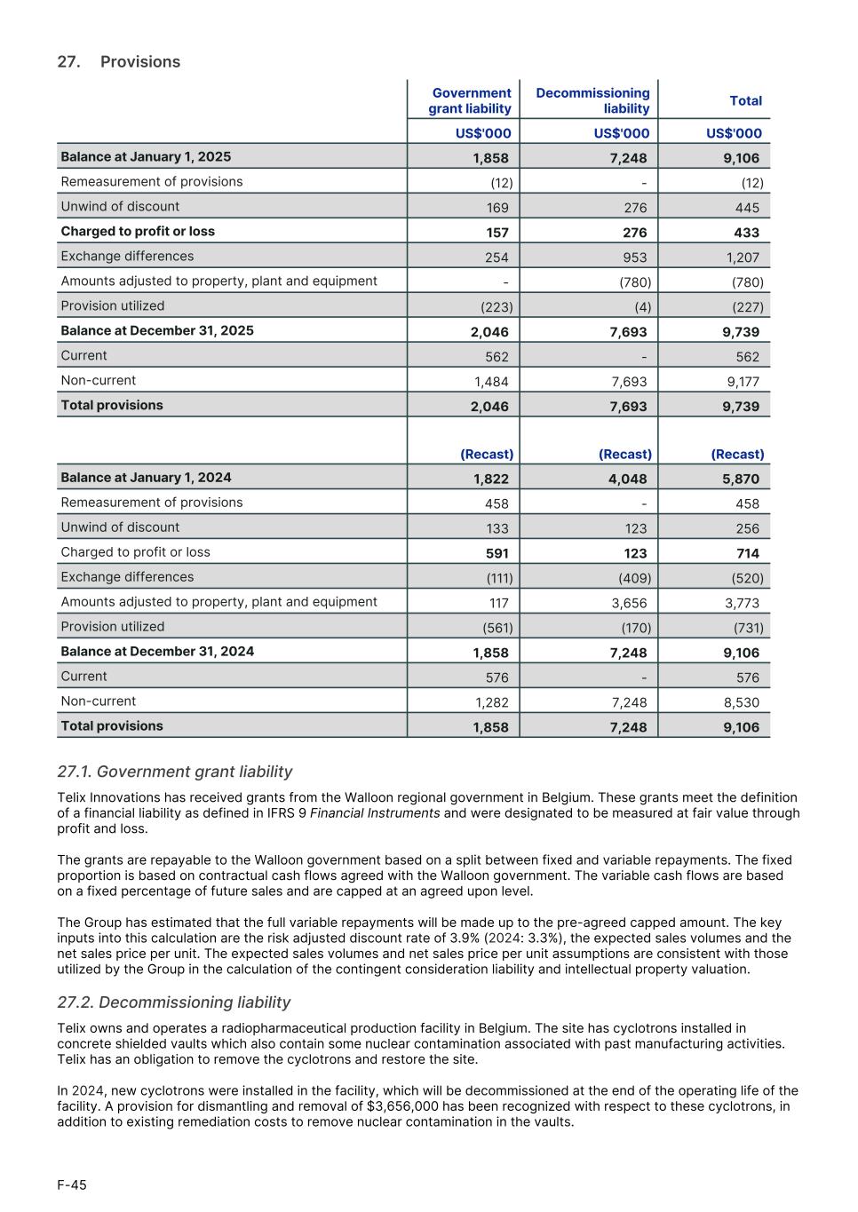 27.     Provisions Government grant liability Decommissioning liability Total1. US$'000 US$'000 US$'000 Balance at January 1, 2025 1,858 7,248 9,106 Remeasurement of provisions (12) - (12) Unwind of discount 169 276 445 Charged to profit or loss 157 276 433 Exchange differences 254 953 1,207 Amounts adjusted to property, plant and equipment - (780) (780) Provision utilized (223) (4) (227) Balance at December 31, 2025 2,046 7,693 9,739 Current 562 - 562 Non-current 1,484 7,693 9,177 Total provisions 2,046 7,693 9,739 (Recast) (Recast) (Recast) Balance at January 1, 2024 1,822 4,048 5,870 Remeasurement of provisions 458 - 458 Unwind of discount 133 123 256 Charged to profit or loss 591 123 714 Exchange differences (111) (409) (520) Amounts adjusted to property, plant and equipment 117 3,656 3,773 Provision utilized (561) (170) (731) Balance at December 31, 2024 1,858 7,248 9,106 Current 576 - 576 Non-current 1,282 7,248 8,530 Total provisions 1,858 7,248 9,106 27.1. Government grant liability Telix Innovations has received grants from the Walloon regional government in Belgium. These grants meet the definition of a financial liability as defined in IFRS 9 Financial Instruments and were designated to be measured at fair value through profit and loss. The grants are repayable to the Walloon government based on a split between fixed and variable repayments. The fixed proportion is based on contractual cash flows agreed with the Walloon government. The variable cash flows are based on a fixed percentage of future sales and are capped at an agreed upon level. The Group has estimated that the full variable repayments will be made up to the pre-agreed capped amount. The key inputs into this calculation are the risk adjusted discount rate of 3.9% (2024: 3.3%), the expected sales volumes and the net sales price per unit. The expected sales volumes and net sales price per unit assumptions are consistent with those utilized by the Group in the calculation of the contingent consideration liability and intellectual property valuation. 27.2. Decommissioning liability Telix owns and operates a radiopharmaceutical production facility in Belgium. The site has cyclotrons installed in concrete shielded vaults which also contain some nuclear contamination associated with past manufacturing activities. Telix has an obligation to remove the cyclotrons and restore the site. In 2024, new cyclotrons were installed in the facility, which will be decommissioned at the end of the operating life of the facility. A provision for dismantling and removal of $3,656,000 has been recognized with respect to these cyclotrons, in addition to existing remediation costs to remove nuclear contamination in the vaults. F-45