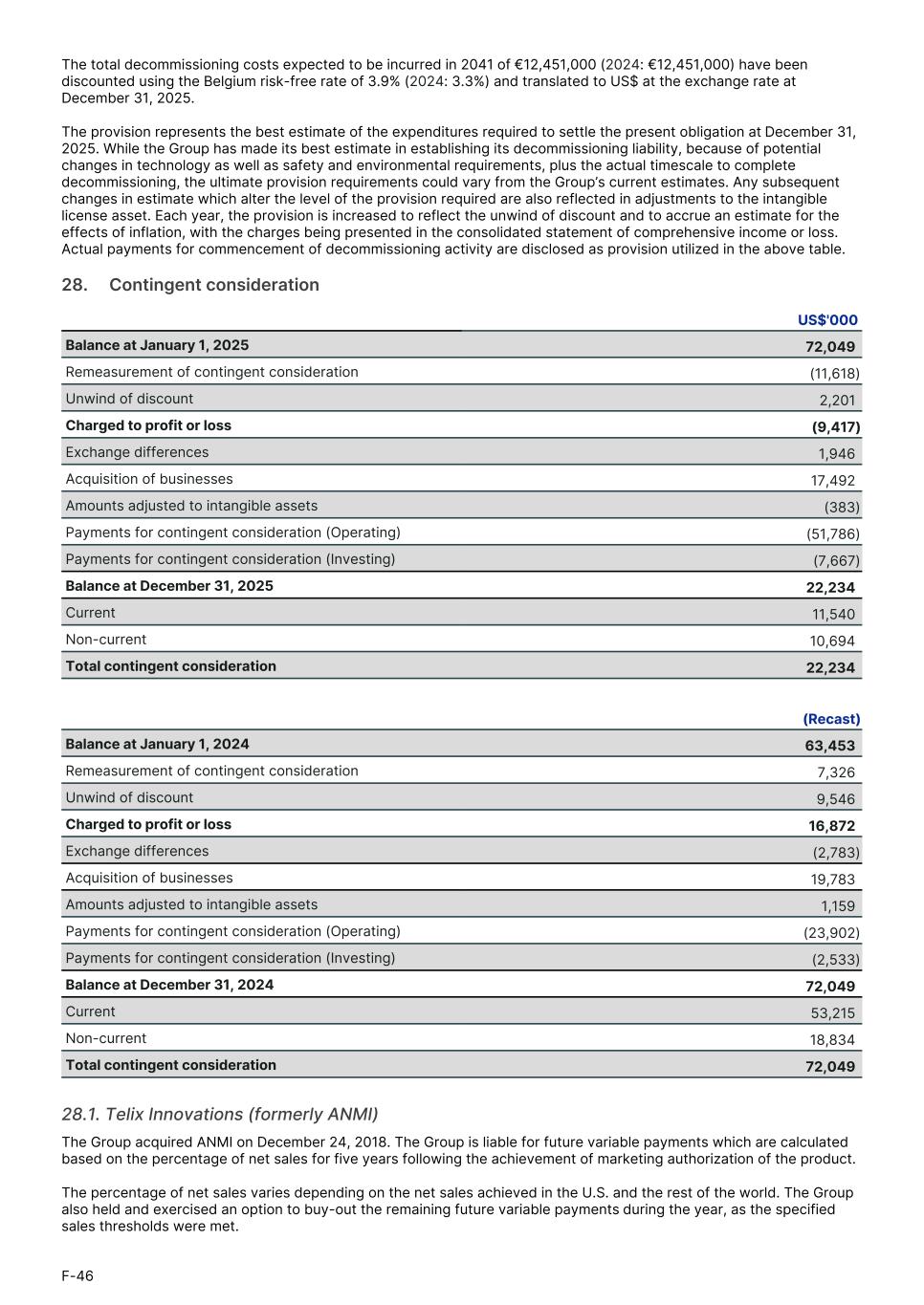 The total decommissioning costs expected to be incurred in 2041 of €12,451,000 (2024: €12,451,000) have been discounted using the Belgium risk-free rate of 3.9% (2024: 3.3%) and translated to US$ at the exchange rate at December 31, 2025. The provision represents the best estimate of the expenditures required to settle the present obligation at December 31, 2025. While the Group has made its best estimate in establishing its decommissioning liability, because of potential changes in technology as well as safety and environmental requirements, plus the actual timescale to complete decommissioning, the ultimate provision requirements could vary from the Group’s current estimates. Any subsequent changes in estimate which alter the level of the provision required are also reflected in adjustments to the intangible license asset. Each year, the provision is increased to reflect the unwind of discount and to accrue an estimate for the effects of inflation, with the charges being presented in the consolidated statement of comprehensive income or loss. Actual payments for commencement of decommissioning activity are disclosed as provision utilized in the above table. 28.     Contingent consideration US$'000 Balance at January 1, 2025 72,049 Remeasurement of contingent consideration (11,618) Unwind of discount 2,201 Charged to profit or loss (9,417) Exchange differences 1,946 Acquisition of businesses 17,492 Amounts adjusted to intangible assets (383) Payments for contingent consideration (Operating) (51,786) Payments for contingent consideration (Investing) (7,667) Balance at December 31, 2025 22,234 Current 11,540 Non-current 10,694 Total contingent consideration 22,234 (Recast) Balance at January 1, 2024 63,453 Remeasurement of contingent consideration 7,326 Unwind of discount 9,546 Charged to profit or loss 16,872 Exchange differences (2,783) Acquisition of businesses 19,783 Amounts adjusted to intangible assets 1,159 Payments for contingent consideration (Operating) (23,902) Payments for contingent consideration (Investing) (2,533) Balance at December 31, 2024 72,049 Current 53,215 Non-current 18,834 Total contingent consideration 72,049 28.1. Telix Innovations (formerly ANMI) The Group acquired ANMI on December 24, 2018. The Group is liable for future variable payments which are calculated based on the percentage of net sales for five years following the achievement of marketing authorization of the product. The percentage of net sales varies depending on the net sales achieved in the U.S. and the rest of the world. The Group also held and exercised an option to buy-out the remaining future variable payments during the year, as the specified sales thresholds were met. F-46
