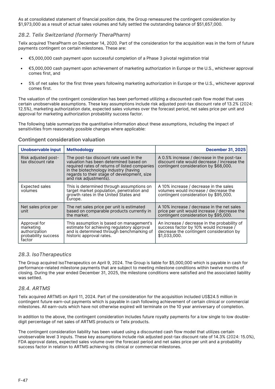 As at consolidated statement of financial position date, the Group remeasured the contingent consideration by $1,973,000 as a result of actual sales volumes and fully settled the outstanding balance of $51,657,000. 28.2. Telix Switzerland (formerly TheraPharm) Telix acquired TheraPharm on December 14, 2020. Part of the consideration for the acquisition was in the form of future payments contingent on certain milestones. These are: • €5,000,000 cash payment upon successful completion of a Phase 3 pivotal registration trial • €5,000,000 cash payment upon achievement of marketing authorization in Europe or the U.S., whichever approval comes first, and • 5% of net sales for the first three years following marketing authorization in Europe or the U.S., whichever approval comes first. The valuation of the contingent consideration has been performed utilizing a discounted cash flow model that uses certain unobservable assumptions. These key assumptions include risk adjusted post-tax discount rate of 13.2% (2024: 12.5%), marketing authorization date, expected sales volumes over the forecast period, net sales price per unit and approval for marketing authorization probability success factor. The following table summarizes the quantitative information about these assumptions, including the impact of sensitivities from reasonably possible changes where applicable: Contingent consideration valuation 1.Unobservable input Methodology December 31, 2025 Risk adjusted post- tax discount rate The post-tax discount rate used in the valuation has been determined based on required rates of returns of listed companies in the biotechnology industry (having regards to their stage of development, size and risk adjustments). A 0.5% increase / decrease in the post-tax discount rate would decrease / increase the contingent consideration by $68,000. Expected sales volumes This is determined through assumptions on target market population, penetration and growth rates in the United States and Europe. A 10% increase / decrease in the sales volumes would increase / decrease the contingent consideration by $95,000. Net sales price per unit The net sales price per unit is estimated based on comparable products currently in the market. A 10% increase / decrease in the net sales price per unit would increase / decrease the contingent consideration by $95,000. Approval for marketing authorization probability success factor This assumption is based on management’s estimate for achieving regulatory approval and is determined through benchmarking of historic approval rates. An increase / decrease in the probability of success factor by 10% would increase / decrease the contingent consideration by $1,033,000. 28.3. IsoTherapeutics The Group acquired IsoTherapeutics on April 9, 2024. The Group is liable for $5,000,000 which is payable in cash for performance-related milestone payments that are subject to meeting milestone conditions within twelve months of closing. During the year ended December 31, 2025, the milestone conditions were satisfied and the associated liability was settled. 28.4. ARTMS Telix acquired ARTMS on April 11, 2024. Part of the consideration for the acquisition included US$24.5 million in contingent future earn-out payments which is payable in cash following achievement of certain clinical or commercial milestones. All earn-outs which have not otherwise expired will terminate on the 10 year anniversary of completion. In addition to the above, the contingent consideration includes future royalty payments for a low single to low double- digit percentage of net sales of ARTMS products or Telix products. The contingent consideration liability has been valued using a discounted cash flow model that utilizes certain unobservable level 3 inputs. These key assumptions include risk adjusted post-tax discount rate of 14.3% (2024: 15.0%), FDA approval dates, expected sales volume over the forecast period and net sales price per unit and a probability success factor in relation to ARTMS achieving its clinical or commercial milestones. F-47