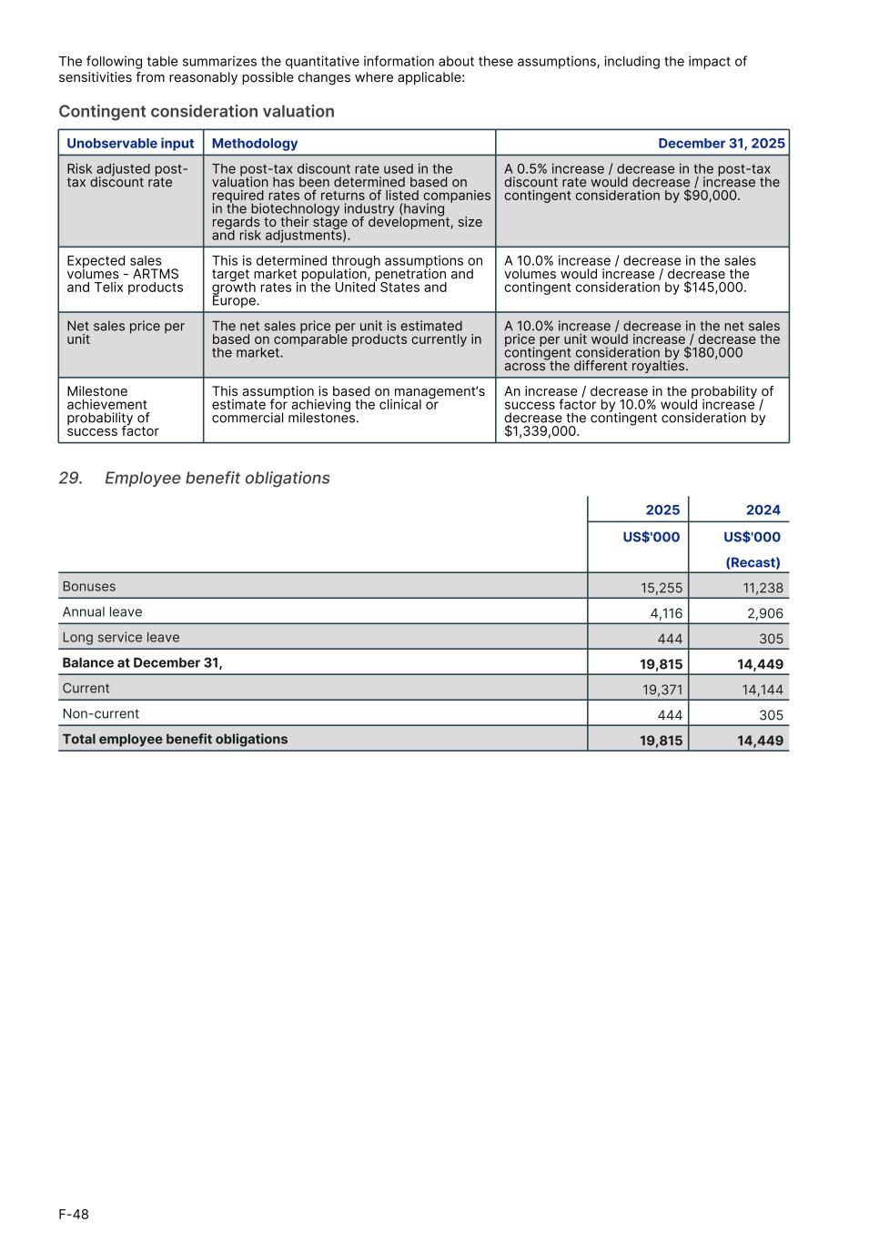 The following table summarizes the quantitative information about these assumptions, including the impact of sensitivities from reasonably possible changes where applicable: Contingent consideration valuation 1.Unobservable input Methodology December 31, 2025 Risk adjusted post- tax discount rate The post-tax discount rate used in the valuation has been determined based on required rates of returns of listed companies in the biotechnology industry (having regards to their stage of development, size and risk adjustments). A 0.5% increase / decrease in the post-tax discount rate would decrease / increase the contingent consideration by $90,000. Expected sales volumes - ARTMS and Telix products This is determined through assumptions on target market population, penetration and growth rates in the United States and Europe. A 10.0% increase / decrease in the sales volumes would increase / decrease the contingent consideration by $145,000. Net sales price per unit The net sales price per unit is estimated based on comparable products currently in the market. A 10.0% increase / decrease in the net sales price per unit would increase / decrease the contingent consideration by $180,000 across the different royalties. Milestone achievement probability of success factor This assumption is based on management’s estimate for achieving the clinical or commercial milestones. An increase / decrease in the probability of success factor by 10.0% would increase / decrease the contingent consideration by $1,339,000. 29.     Employee benefit obligations 2025 2024 US$'000 US$'000 (Recast) Bonuses 15,255 11,238 Annual leave 4,116 2,906 Long service leave 444 305 Balance at December 31, 19,815 14,449 Current 19,371 14,144 Non-current 444 305 Total employee benefit obligations 19,815 14,449 F-48
