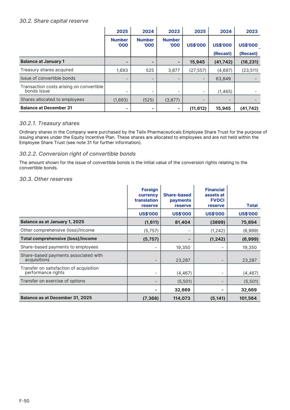 30.2. Share capital reserve 2025 2024 2023 2025 2024 2023 Number ’000 Number ’000 Number ‘000 US$'000 US$'000 US$'0001. (Recast) (Recast) Balance at January 1 - - - 15,945 (41,742) (18,231) Treasury shares acquired 1,693 525 3,877 (27,557) (4,697) (23,511) Issue of convertible bonds - - - - 63,849 - Transaction costs arising on convertible bonds issue - - - - (1,465) - Shares allocated to employees (1,693) (525) (3,877) - - - Balance at December 31 - - - (11,612) 15,945 (41,742) 30.2.1. Treasury shares Ordinary shares in the Company were purchased by the Telix Pharmaceuticals Employee Share Trust for the purpose of issuing shares under the Equity Incentive Plan. These shares are allocated to employees and are not held within the Employee Share Trust (see note 31 for further information). 30.2.2. Conversion right of convertible bonds The amount shown for the issue of convertible bonds is the initial value of the conversion rights relating to the convertible bonds. 30.3. Other reserves Foreign currency translation reserve Share-based payments reserve Financial assets at FVOCI reserve Total1. US$'000 US$'000 US$'000 US$'000 Balance as at January 1, 2025 (1,611) 81,404 (3899) 75,894 Other comprehensive (loss)/income (5,757) - (1,242) (6,999) Total comprehensive (loss)/income (5,757) - (1,242) (6,999) Share-based payments to employees - 19,350 - 19,350 Share-based payments associated with acquisitions - 23,287 - 23,287 Transfer on satisfaction of acquisition performance rights - (4,467) - (4,467) Transfer on exercise of options - (5,501) - (5,501) - 32,669 - 32,669 Balance as at December 31, 2025 (7,368) 114,073 (5,141) 101,564 F-50