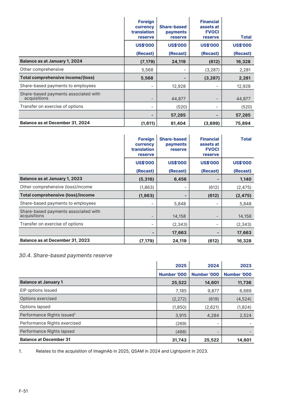Foreign currency translation reserve Share-based payments reserve Financial assets at FVOCI reserve Total1. US$'000 US$'000 US$'000 US$'000 (Recast) (Recast) (Recast) (Recast) Balance as at January 1, 2024 (7,179) 24,119 (612) 16,328 Other comprehensive 5,568 - (3,287) 2,281 Total comprehensive income/(loss) 5,568 - (3,287) 2,281 Share-based payments to employees - 12,928 - 12,928 Share-based payments associated with acquisitions - 44,877 - 44,877 Transfer on exercise of options - (520) - (520) - 57,285 - 57,285 Balance as at December 31, 2024 (1,611) 81,404 (3,899) 75,894 Foreign currency translation reserve Share-based payments reserve Financial assets at FVOCI reserve Total1. US$'000 US$'000 US$'000 US$'000 (Recast) (Recast) (Recast) (Recast) Balance as at January 1, 2023 (5,316) 6,456 - 1,140 Other comprehensive (loss)/income (1,863) - (612) (2,475) Total comprehensive (loss)/income (1,863) - (612) (2,475) Share-based payments to employees - 5,848 - 5,848 Share-based payments associated with acquisitions - 14,158 - 14,158 Transfer on exercise of options - (2,343) - (2,343) - 17,663 - 17,663 Balance as at December 31, 2023 (7,179) 24,119 (612) 16,328 30.4. Share-based payments reserve 2025 2024 2023 Number ’000 Number ’000 Number ‘000 Balance at January 1 25,522 14,601 11,736 EIP options issued 7,185 9,877 6,689 Options exercised (2,272) (619) (4,524) Options lapsed (1,850) (2,621) (1,824) Performance Rights issued1 3,915 4,284 2,524 Performance Rights exercised (269) - - Performance Rights lapsed (488) - - Balance at December 31 31,743 25,522 14,601 1. Relates to the acquisition of ImaginAb in 2025, QSAM in 2024 and Lightpoint in 2023. F-51