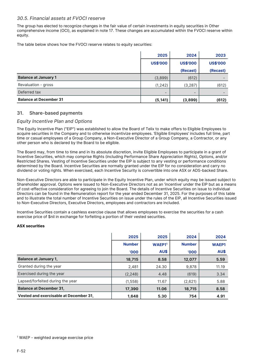 30.5. Financial assets at FVOCI reserve The group has elected to recognize changes in the fair value of certain investments in equity securities in Other comprehensive income (OCI), as explained in note 17. These changes are accumulated within the FVOCI reserve within equity. The table below shows how the FVOCI reserve relates to equity securities: 2025 2024 2023 US$'000 US$'000 US$'0001. (Recast) (Recast)1. Balance at January 1 (3,899) (612) - Revaluation - gross (1,242) (3,287) (612) Deferred tax - - - Balance at December 31 (5,141) (3,899) (612) 31.     Share-based payments Equity Incentive Plan and Options The Equity Incentive Plan ("EIP") was established to allow the Board of Telix to make offers to Eligible Employees to acquire securities in the Company and to otherwise incentivize employees. ‘Eligible Employees’ includes full time, part time or casual employees of a Group Company, a Non-Executive Director of a Group Company, a Contractor, or any other person who is declared by the Board to be eligible. The Board may, from time to time and in its absolute discretion, invite Eligible Employees to participate in a grant of Incentive Securities, which may comprise Rights (including Performance Share Appreciation Rights), Options, and/or Restricted Shares. Vesting of Incentive Securities under the EIP is subject to any vesting or performance conditions determined by the Board. Incentive Securities are normally granted under the EIP for no consideration and carry no dividend or voting rights. When exercised, each Incentive Security is convertible into one ASX or ADS-backed Share. Non-Executive Directors are able to participate in the Equity Incentive Plan, under which equity may be issued subject to Shareholder approval. Options were issued to Non-Executive Directors not as an ‘incentive’ under the EIP but as a means of cost-effective consideration for agreeing to join the Board. The details of Incentive Securities on issue to individual Directors can be found in the Remuneration report for the year ended December 31, 2025. For the purposes of this table and to illustrate the total number of Incentive Securities on issue under the rules of the EIP, all Incentive Securities issued to Non-Executive Directors, Executive Directors, employees and contractors are included. Incentive Securities contain a cashless exercise clause that allows employees to exercise the securities for a cash exercise price of $nil in exchange for forfeiting a portion of their vested securities. ASX securities 2025 2025 2024 2024 Number WAEP11 Number WAEP11. ‘000 AU$ ‘000 AU$1. Balance at January 1, 18,715 8.58 12,077 5.59 Granted during the year 2,481 24.30 9,878 11.19 Exercised during the year (2,248) 4.48 (619) 3.34 Lapsed/forfeited during the year (1,558) 11.67 (2,621) 5.88 Balance at December 31, 17,390 11.06 18,715 8.58 Vested and exercisable at December 31, 1,648 5.30 754 4.91 F-52 1 WAEP - weighted average exercise price