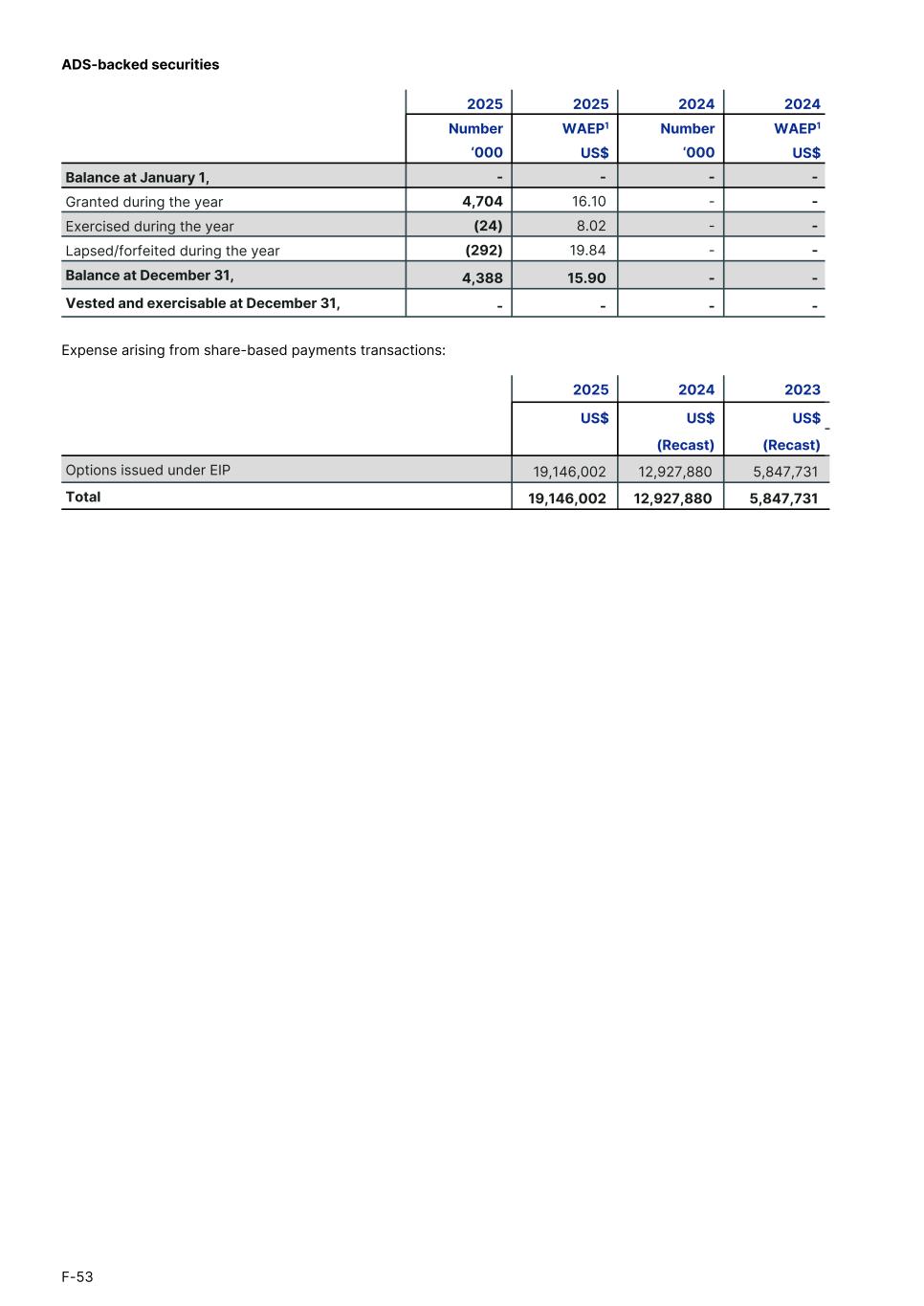ADS-backed securities 2025 2025 2024 2024 Number WAEP1 Number WAEP1 ‘000 US$ ‘000 US$ Balance at January 1, - - - - Granted during the year 4,704 16.10 - - Exercised during the year (24) 8.02 - - Lapsed/forfeited during the year (292) 19.84 - - Balance at December 31, 4,388 15.90 - - Vested and exercisable at December 31, - - - - Expense arising from share-based payments transactions: 2025 2024 2023 US$ US$ US$1. (Recast) (Recast)1. Options issued under EIP 19,146,002 12,927,880 5,847,731 Total 19,146,002 12,927,880 5,847,731 F-53