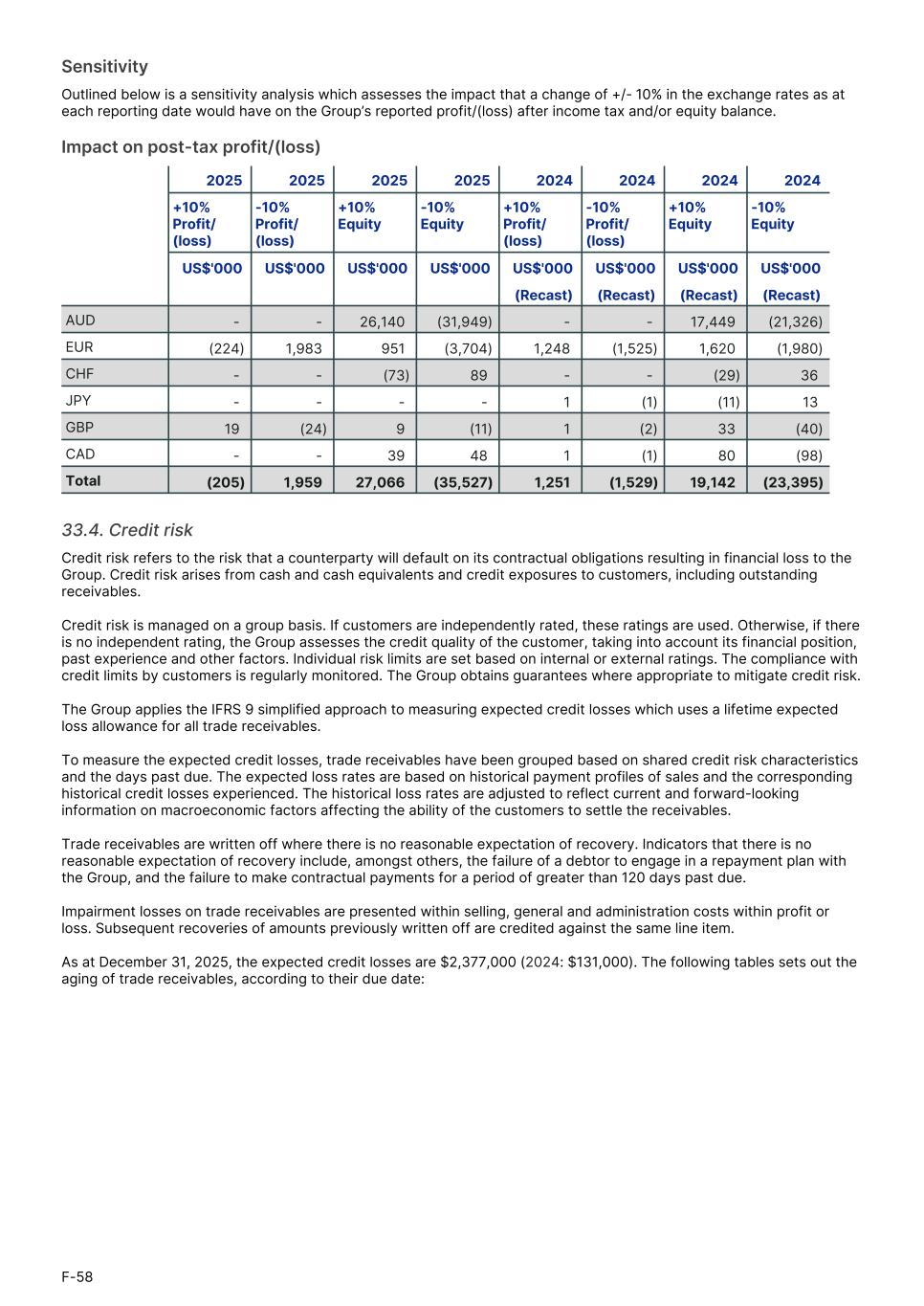 Sensitivity Outlined below is a sensitivity analysis which assesses the impact that a change of +/- 10% in the exchange rates as at each reporting date would have on the Group’s reported profit/(loss) after income tax and/or equity balance. Impact on post-tax profit/(loss) 2025 2025 2025 2025 2024 2024 2024 2024 +10% Profit/ (loss) -10% Profit/ (loss) +10% Equity -10% Equity +10% Profit/ (loss) -10% Profit/ (loss) +10% Equity -10% Equity1. US$'000 US$'000 US$'000 US$'000 US$'000 US$'000 US$'000 US$'0001. (Recast) (Recast) (Recast) (Recast)1. AUD - - 26,140 (31,949) - - 17,449 (21,326) EUR (224) 1,983 951 (3,704) 1,248 (1,525) 1,620 (1,980) CHF - - (73) 89 - - (29) 36 JPY - - - - 1 (1) (11) 13 GBP 19 (24) 9 (11) 1 (2) 33 (40) CAD - - 39 48 1 (1) 80 (98) Total (205) 1,959 27,066 (35,527) 1,251 (1,529) 19,142 (23,395) 33.4. Credit risk Credit risk refers to the risk that a counterparty will default on its contractual obligations resulting in financial loss to the Group. Credit risk arises from cash and cash equivalents and credit exposures to customers, including outstanding receivables. Credit risk is managed on a group basis. If customers are independently rated, these ratings are used. Otherwise, if there is no independent rating, the Group assesses the credit quality of the customer, taking into account its financial position, past experience and other factors. Individual risk limits are set based on internal or external ratings. The compliance with credit limits by customers is regularly monitored. The Group obtains guarantees where appropriate to mitigate credit risk. The Group applies the IFRS 9 simplified approach to measuring expected credit losses which uses a lifetime expected loss allowance for all trade receivables. To measure the expected credit losses, trade receivables have been grouped based on shared credit risk characteristics and the days past due. The expected loss rates are based on historical payment profiles of sales and the corresponding historical credit losses experienced. The historical loss rates are adjusted to reflect current and forward-looking information on macroeconomic factors affecting the ability of the customers to settle the receivables. Trade receivables are written off where there is no reasonable expectation of recovery. Indicators that there is no reasonable expectation of recovery include, amongst others, the failure of a debtor to engage in a repayment plan with the Group, and the failure to make contractual payments for a period of greater than 120 days past due. Impairment losses on trade receivables are presented within selling, general and administration costs within profit or loss. Subsequent recoveries of amounts previously written off are credited against the same line item. As at December 31, 2025, the expected credit losses are $2,377,000 (2024: $131,000). The following tables sets out the aging of trade receivables, according to their due date: F-58