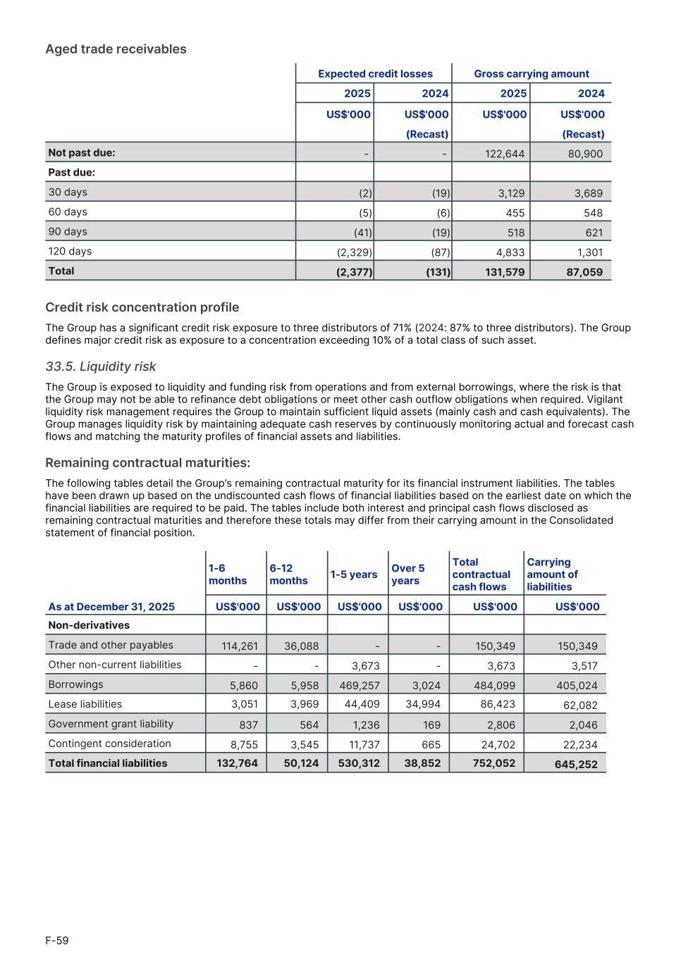 Aged trade receivables Expected credit losses Gross carrying amount1. 2025 2024 2025 2024 US$'000 US$'000 US$'000 US$'0001. (Recast) (Recast)1. Not past due: - - 122,644 80,900 Past due: 30 days (2) (19) 3,129 3,689 60 days (5) (6) 455 548 90 days (41) (19) 518 621 120 days (2,329) (87) 4,833 1,301 Total (2,377) (131) 131,579 87,059 Credit risk concentration profile The Group has a significant credit risk exposure to three distributors of 71% (2024: 87% to three distributors). The Group defines major credit risk as exposure to a concentration exceeding 10% of a total class of such asset. 33.5. Liquidity risk The Group is exposed to liquidity and funding risk from operations and from external borrowings, where the risk is that the Group may not be able to refinance debt obligations or meet other cash outflow obligations when required. Vigilant liquidity risk management requires the Group to maintain sufficient liquid assets (mainly cash and cash equivalents). The Group manages liquidity risk by maintaining adequate cash reserves by continuously monitoring actual and forecast cash flows and matching the maturity profiles of financial assets and liabilities. Remaining contractual maturities: The following tables detail the Group’s remaining contractual maturity for its financial instrument liabilities. The tables have been drawn up based on the undiscounted cash flows of financial liabilities based on the earliest date on which the financial liabilities are required to be paid. The tables include both interest and principal cash flows disclosed as remaining contractual maturities and therefore these totals may differ from their carrying amount in the Consolidated statement of financial position. 1-6 months 6-12 months 1-5 years Over 5 years Total contractual cash flows Carrying amount of liabilities As at December 31, 2025 US$'000 US$'000 US$'000 US$'000 US$'000 US$'000 Non-derivatives Trade and other payables 114,261 36,088 - - 150,349 150,349 Other non-current liabilities - - 3,673 - 3,673 3,517 Borrowings 5,860 5,958 469,257 3,024 484,099 405,024 Lease liabilities 3,051 3,969 44,409 34,994 86,423 62,082 Government grant liability 837 564 1,236 169 2,806 2,046 Contingent consideration 8,755 3,545 11,737 665 24,702 22,234 Total financial liabilities 132,764 50,124 530,312 38,852 752,052 645,252 F-59