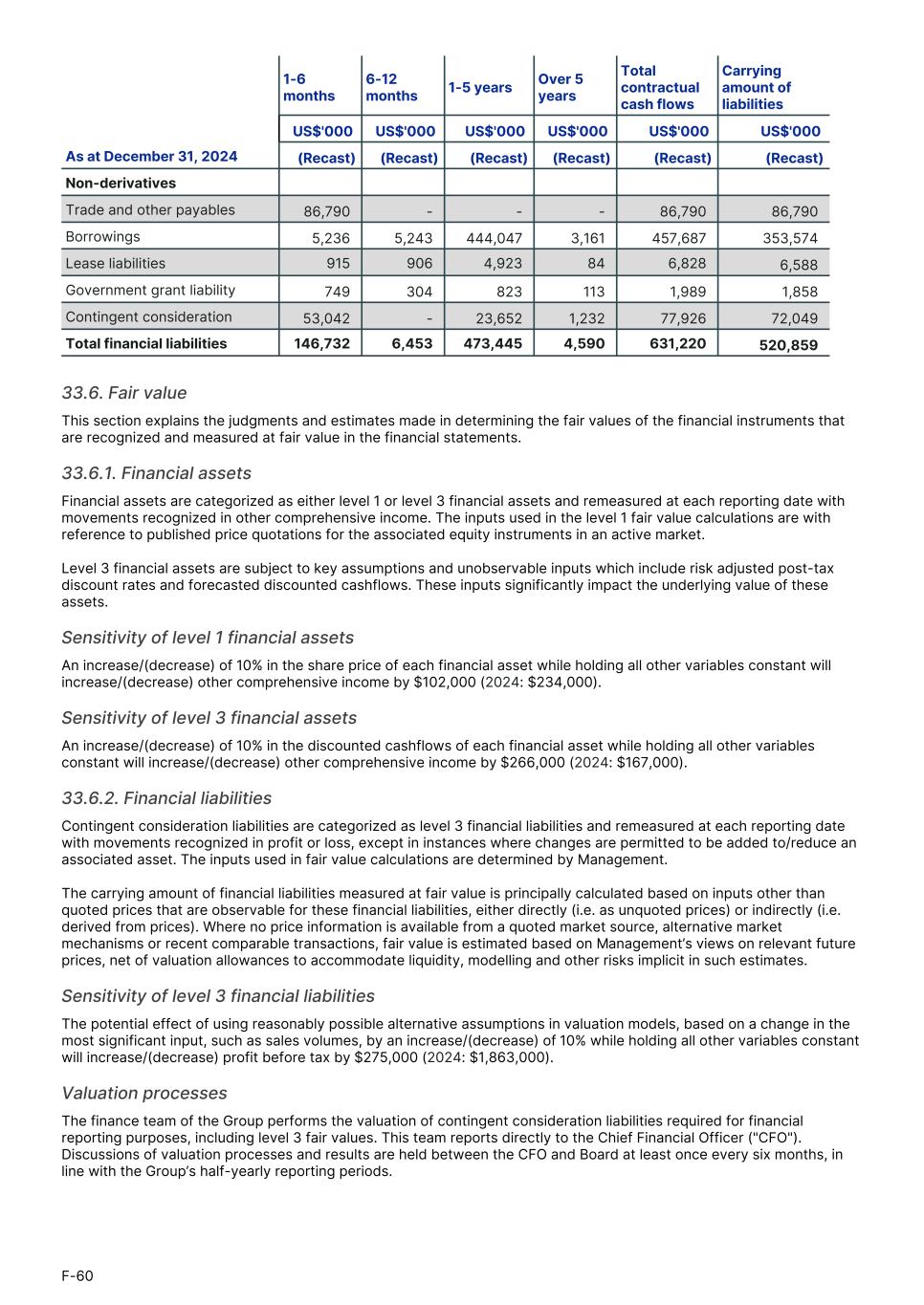 1-6 months 6-12 months 1-5 years Over 5 years Total contractual cash flows Carrying amount of liabilities1. US$'000 US$'000 US$'000 US$'000 US$'000 US$'000 As at December 31, 2024 (Recast) (Recast) (Recast) (Recast) (Recast) (Recast) Non-derivatives Trade and other payables 86,790 - - - 86,790 86,790 Borrowings 5,236 5,243 444,047 3,161 457,687 353,574 Lease liabilities 915 906 4,923 84 6,828 6,588 Government grant liability 749 304 823 113 1,989 1,858 Contingent consideration 53,042 - 23,652 1,232 77,926 72,049 Total financial liabilities 146,732 6,453 473,445 4,590 631,220 520,859 33.6. Fair value This section explains the judgments and estimates made in determining the fair values of the financial instruments that are recognized and measured at fair value in the financial statements. 33.6.1. Financial assets Financial assets are categorized as either level 1 or level 3 financial assets and remeasured at each reporting date with movements recognized in other comprehensive income. The inputs used in the level 1 fair value calculations are with reference to published price quotations for the associated equity instruments in an active market. Level 3 financial assets are subject to key assumptions and unobservable inputs which include risk adjusted post-tax discount rates and forecasted discounted cashflows. These inputs significantly impact the underlying value of these assets. Sensitivity of level 1 financial assets An increase/(decrease) of 10% in the share price of each financial asset while holding all other variables constant will increase/(decrease) other comprehensive income by $102,000 (2024: $234,000). Sensitivity of level 3 financial assets An increase/(decrease) of 10% in the discounted cashflows of each financial asset while holding all other variables constant will increase/(decrease) other comprehensive income by $266,000 (2024: $167,000). 33.6.2. Financial liabilities Contingent consideration liabilities are categorized as level 3 financial liabilities and remeasured at each reporting date with movements recognized in profit or loss, except in instances where changes are permitted to be added to/reduce an associated asset. The inputs used in fair value calculations are determined by Management. The carrying amount of financial liabilities measured at fair value is principally calculated based on inputs other than quoted prices that are observable for these financial liabilities, either directly (i.e. as unquoted prices) or indirectly (i.e. derived from prices). Where no price information is available from a quoted market source, alternative market mechanisms or recent comparable transactions, fair value is estimated based on Management’s views on relevant future prices, net of valuation allowances to accommodate liquidity, modelling and other risks implicit in such estimates. Sensitivity of level 3 financial liabilities The potential effect of using reasonably possible alternative assumptions in valuation models, based on a change in the most significant input, such as sales volumes, by an increase/(decrease) of 10% while holding all other variables constant will increase/(decrease) profit before tax by $275,000 (2024: $1,863,000). Valuation processes The finance team of the Group performs the valuation of contingent consideration liabilities required for financial reporting purposes, including level 3 fair values. This team reports directly to the Chief Financial Officer ("CFO"). Discussions of valuation processes and results are held between the CFO and Board at least once every six months, in line with the Group’s half-yearly reporting periods. F-60