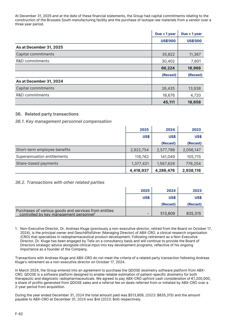 At December 31, 2025 and at the date of these financial statements, the Group had capital commitments relating to the construction of the Brussels South manufacturing facility and the purchase of isotope raw materials from a vendor over a three year period. Due < 1 year Due > 1 year1. US$'000 US$'0001. As at December 31, 2025 Capital commitments 35,822 11,367 R&D commitments 30,402 7,601 66,224 18,968 (Recast) (Recast) As at December 31, 2024 Capital commitments 26,435 13,938 R&D commitments 18,676 4,720 45,111 18,658 36.   Related party transactions 36.1. Key management personnel compensation 2025 2024 2023 1. US$ US$ US$1. (Recast) (Recast)1. Short-term employee benefits 2,922,754 2,577,798 2,056,147 Superannuation entitlements 118,762 141,049 105,715 Share-based payments 1,377,421 1,567,629 776,254 4,418,937 4,286,476 2,938,116 36.2. Transactions with other related parties 2025 2024 2023 US$ US$ US$ (Recast) (Recast) Purchases of various goods and services from entities controlled by key management personnel1 - 513,809 835,315 1. Non-Executive Director, Dr. Andreas Kluge (previously a non-executive director, retired from the Board on October 17, 2024), is the principal owner and Geschäftsführer (Managing Director) of ABX-CRO, a clinical research organization (CRO) that specializes in radiopharmaceutical product development. Following retirement as a Non-Executive Director, Dr. Kluge has been engaged by Telix on a consultancy basis and will continue to provide the Board of Directors strategic advice alongside clinical input into key development programs, reflective of his ongoing importance as a founder of the Company. Transactions with Andreas Kluge and ABX-CRO do not meet the criteria of a related party transaction following Andreas Kluge's retirement as a non-executive director on October 17, 2024. In March 2024, the Group entered into an agreement to purchase the QDOSE dosimetry software platform from ABX- CRO. QDOSE is a software platform designed to enable reliable estimation of patient-specific dosimetry for both therapeutic and diagnostic radiopharmaceuticals. We agreed to pay ABX-CRO upfront cash consideration of €1,200,000, a share of profits generated from QDOSE sales and a referral fee on deals referred from or initiated by ABX-CRO over a 2-year period from acquisition. During the year ended December 31, 2024 the total amount paid was $513,809, (2023: $835,315) and the amount payable to ABX-CRO at December 31, 2024 was $nil (2023: $nil) respectively. F-62