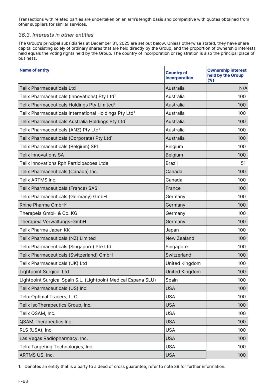 Transactions with related parties are undertaken on an arm’s length basis and competitive with quotes obtained from other suppliers for similar services. 36.3. Interests in other entities The Group’s principal subsidiaries at December 31, 2025 are set out below. Unless otherwise stated, they have share capital consisting solely of ordinary shares that are held directly by the Group, and the proportion of ownership interests held equals the voting rights held by the Group. The country of incorporation or registration is also the principal place of business. Telix Pharmaceuticals Ltd Australia N/A Telix Pharmaceuticals (Innovations) Pty Ltd1 Australia 100 Telix Pharmaceuticals Holdings Pty Limited1 Australia 100 Telix Pharmaceuticals International Holdings Pty Ltd1 Australia 100 Telix Pharmaceuticals Australia Holdings Pty Ltd1 Australia 100 Telix Pharmaceuticals (ANZ) Pty Ltd1 Australia 100 Telix Pharmaceuticals (Corporate) Pty Ltd1 Australia 100 Telix Pharmaceuticals (Belgium) SRL Belgium 100 Telix Innovations SA Belgium 100 Telix Innovations Rph Participacoes Ltda Brazil 51 Telix Pharmaceuticals (Canada) Inc. Canada 100 Telix ARTMS Inc. Canada 100 Telix Pharmaceuticals (France) SAS France 100 Telix Pharmaceuticals (Germany) GmbH Germany 100 Rhine Pharma GmbH2 Germany 100 Therapeia GmbH & Co. KG Germany 100 Therapeia Verwaltungs-GmbH Germany 100 Telix Pharma Japan KK Japan 100 Telix Pharmaceuticals (NZ) Limited New Zealand 100 Telix Pharmaceuticals (Singapore) Pte Ltd Singapore 100 Telix Pharmaceuticals (Switzerland) GmbH Switzerland 100 Telix Pharmaceuticals (UK) Ltd United Kingdom 100 Lightpoint Surgical Ltd United Kingdom 100 Lightpoint Surgical Spain S.L. (Lightpoint Medical Espana SLU) Spain 100 Telix Pharmaceuticals (US) Inc. USA 100 Telix Optimal Tracers, LLC USA 100 Telix IsoTherapeutics Group, Inc. USA 100 Telix QSAM, Inc. USA 100 QSAM Therapeutics Inc. USA 100 RLS (USA), Inc. USA 100 Las Vegas Radiopharmacy, Inc. USA 100 Telix Targeting Technologies, Inc. USA 100 ARTMS US, Inc. USA 100 Name of entity Country of incorporation Ownership interest held by the Group (%) 1. Denotes an entity that is a party to a deed of cross guarantee, refer to note 39 for further information. F-63
