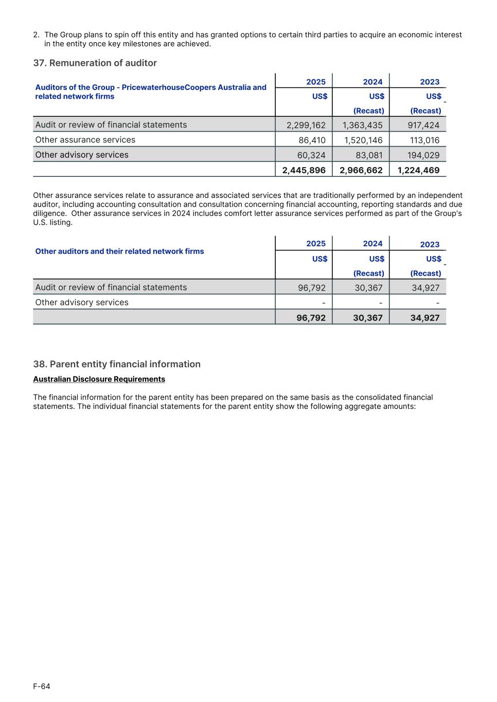 2. The Group plans to spin off this entity and has granted options to certain third parties to acquire an economic interest in the entity once key milestones are achieved. 37. Remuneration of auditor Auditors of the Group - PricewaterhouseCoopers Australia and related network firms 2025 2024 2023 1. US$ US$ US$1. (Recast) (Recast)1. Audit or review of financial statements 2,299,162 1,363,435 917,424 Other assurance services 86,410 1,520,146 113,016 Other advisory services 60,324 83,081 194,029 2,445,896 2,966,662 1,224,469 Other assurance services relate to assurance and associated services that are traditionally performed by an independent auditor, including accounting consultation and consultation concerning financial accounting, reporting standards and due diligence. Other assurance services in 2024 includes comfort letter assurance services performed as part of the Group's U.S. listing. Other auditors and their related network firms 2025 2024 2023 1. US$ US$ US$ 1. (Recast) (Recast) 1. Audit or review of financial statements 96,792 30,367 34,927 Other advisory services - - - 96,792 30,367 34,927 38. Parent entity financial information Australian Disclosure Requirements The financial information for the parent entity has been prepared on the same basis as the consolidated financial statements. The individual financial statements for the parent entity show the following aggregate amounts: F-64