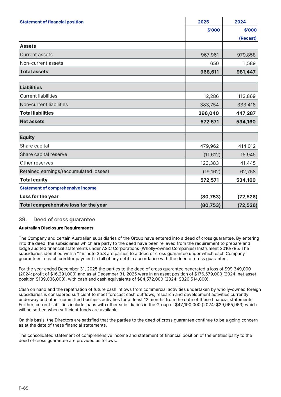Statement of financial position 2025 2024 $’000 $’000 (Recast) Assets Current assets 967,961 979,858 Non-current assets 650 1,589 Total assets 968,611 981,447 Liabilities Current liabilities 12,286 113,869 Non-current liabilities 383,754 333,418 Total liabilities 396,040 447,287 Net assets 572,571 534,160 Equity Share capital 479,962 414,012 Share capital reserve (11,612) 15,945 Other reserves 123,383 41,445 Retained earnings/(accumulated losses) (19,162) 62,758 Total equity 572,571 534,160 Statement of comprehensive income Loss for the year (80,753) (72,526) Total comprehensive loss for the year (80,753) (72,526) 39. Deed of cross guarantee Australian Disclosure Requirements The Company and certain Australian subsidiaries of the Group have entered into a deed of cross guarantee. By entering into the deed, the subsidiaries which are party to the deed have been relieved from the requirement to prepare and lodge audited financial statements under ASIC Corporations (Wholly-owned Companies) Instrument 2016/785. The subsidiaries identified with a ‘1’ in note 35.3 are parties to a deed of cross guarantee under which each Company guarantees to each creditor payment in full of any debt in accordance with the deed of cross guarantee. For the year ended December 31, 2025 the parties to the deed of cross guarantee generated a loss of $99,349,000 (2024: profit of $16,291,000) and as at December 31, 2025 were in an asset position of $176,579,000 (2024: net asset position $189,036,000), with cash and cash equivalents of $84,572,000 (2024: $326,514,000). Cash on hand and the repatriation of future cash inflows from commercial activities undertaken by wholly-owned foreign subsidiaries is considered sufficient to meet forecast cash outflows, research and development activities currently underway and other committed business activities for at least 12 months from the date of these financial statements. Further, current liabilities include loans with other subsidiaries in the Group of $47,190,000 (2024: $29,965,953) which will be settled when sufficient funds are available. On this basis, the Directors are satisfied that the parties to the deed of cross guarantee continue to be a going concern as at the date of these financial statements. The consolidated statement of comprehensive income and statement of financial position of the entities party to the deed of cross guarantee are provided as follows: F-65