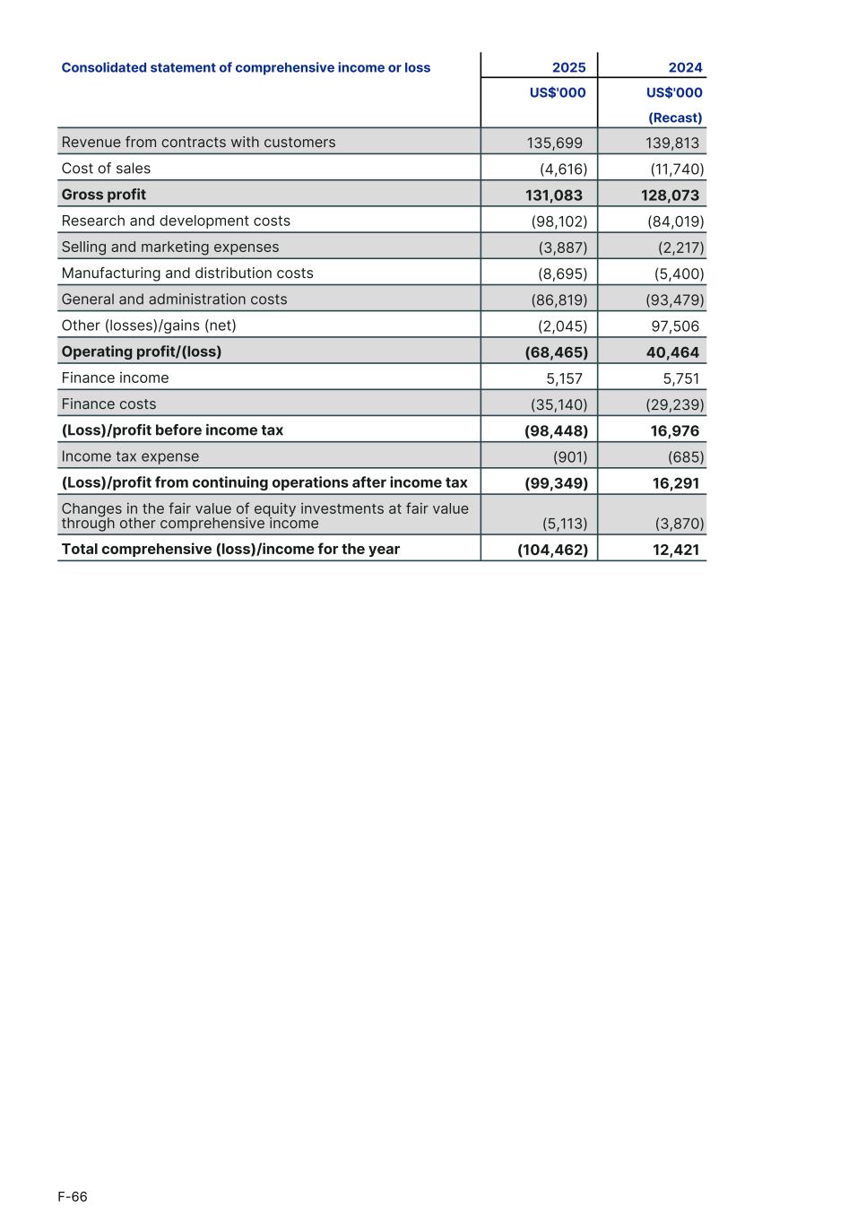 Consolidated statement of comprehensive income or loss 2025 2024 US$'000 US$'000 (Recast) Revenue from contracts with customers 135,699 139,813 Cost of sales (4,616) (11,740) Gross profit 131,083 128,073 Research and development costs (98,102) (84,019) Selling and marketing expenses (3,887) (2,217) Manufacturing and distribution costs (8,695) (5,400) General and administration costs (86,819) (93,479) Other (losses)/gains (net) (2,045) 97,506 Operating profit/(loss) (68,465) 40,464 Finance income 5,157 5,751 Finance costs (35,140) (29,239) (Loss)/profit before income tax (98,448) 16,976 Income tax expense (901) (685) (Loss)/profit from continuing operations after income tax (99,349) 16,291 Changes in the fair value of equity investments at fair value through other comprehensive income (5,113) (3,870) Total comprehensive (loss)/income for the year (104,462) 12,421 F-66