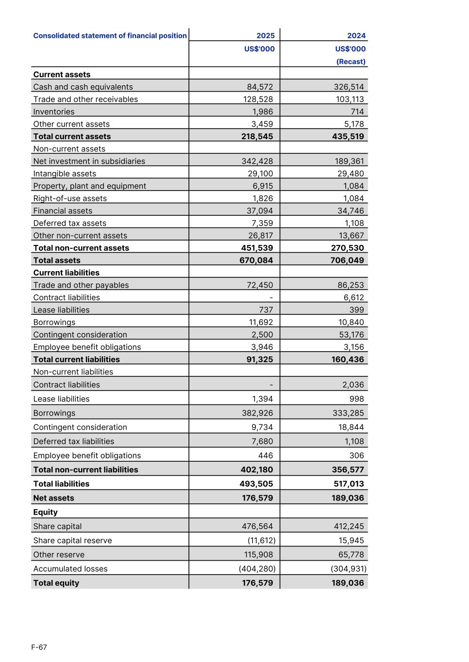 Consolidated statement of financial position 2025 2024 US$'000 US$'000 (Recast) Current assets Cash and cash equivalents 84,572 326,514 Trade and other receivables 128,528 103,113 Inventories 1,986 714 Other current assets 3,459 5,178 Total current assets 218,545 435,519 Non-current assets Net investment in subsidiaries 342,428 189,361 Intangible assets 29,100 29,480 Property, plant and equipment 6,915 1,084 Right-of-use assets 1,826 1,084 Financial assets 37,094 34,746 Deferred tax assets 7,359 1,108 Other non-current assets 26,817 13,667 Total non-current assets 451,539 270,530 Total assets 670,084 706,049 Current liabilities Trade and other payables 72,450 86,253 Contract liabilities - 6,612 Lease liabilities 737 399 Borrowings 11,692 10,840 Contingent consideration 2,500 53,176 Employee benefit obligations 3,946 3,156 Total current liabilities 91,325 160,436 Non-current liabilities Contract liabilities - 2,036 Lease liabilities 1,394 998 Borrowings 382,926 333,285 Contingent consideration 9,734 18,844 Deferred tax liabilities 7,680 1,108 Employee benefit obligations 446 306 Total non-current liabilities 402,180 356,577 Total liabilities 493,505 517,013 Net assets 176,579 189,036 Equity Share capital 476,564 412,245 Share capital reserve (11,612) 15,945 Other reserve 115,908 65,778 Accumulated losses (404,280) (304,931) Total equity 176,579 189,036 F-67