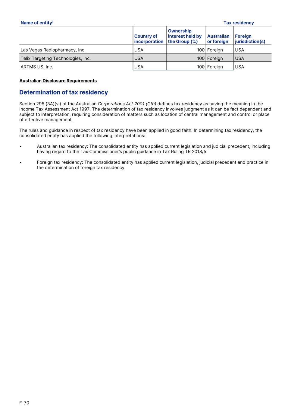 Las Vegas Radiopharmacy, Inc. USA 100 Foreign USA Telix Targeting Technologies, Inc. USA 100 Foreign USA ARTMS US, Inc. USA 100 Foreign USA Name of entity1 Tax residency Country of incorporation Ownership interest held by the Group (%) Australian or foreign Foreign jurisdiction(s) Australian Disclosure Requirements Determination of tax residency Section 295 (3A)(vi) of the Australian Corporations Act 2001 (Cth) defines tax residency as having the meaning in the Income Tax Assessment Act 1997. The determination of tax residency involves judgment as it can be fact dependent and subject to interpretation, requiring consideration of matters such as location of central management and control or place of effective management. The rules and guidance in respect of tax residency have been applied in good faith. In determining tax residency, the consolidated entity has applied the following interpretations: • Australian tax residency: The consolidated entity has applied current legislation and judicial precedent, including having regard to the Tax Commissioner’s public guidance in Tax Ruling TR 2018/5. • Foreign tax residency: The consolidated entity has applied current legislation, judicial precedent and practice in the determination of foreign tax residency. F-70