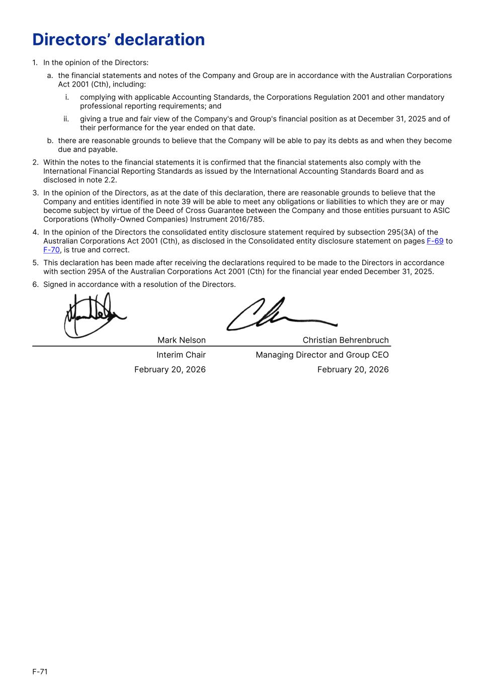 Directors’ declaration 1. In the opinion of the Directors: a. the financial statements and notes of the Company and Group are in accordance with the Australian Corporations Act 2001 (Cth), including: i. complying with applicable Accounting Standards, the Corporations Regulation 2001 and other mandatory professional reporting requirements; and ii. giving a true and fair view of the Company's and Group's financial position as at December 31, 2025 and of their performance for the year ended on that date. b. there are reasonable grounds to believe that the Company will be able to pay its debts as and when they become due and payable. 2. Within the notes to the financial statements it is confirmed that the financial statements also comply with the International Financial Reporting Standards as issued by the International Accounting Standards Board and as disclosed in note 2.2. 3. In the opinion of the Directors, as at the date of this declaration, there are reasonable grounds to believe that the Company and entities identified in note 39 will be able to meet any obligations or liabilities to which they are or may become subject by virtue of the Deed of Cross Guarantee between the Company and those entities pursuant to ASIC Corporations (Wholly-Owned Companies) Instrument 2016/785. 4. In the opinion of the Directors the consolidated entity disclosure statement required by subsection 295(3A) of the Australian Corporations Act 2001 (Cth), as disclosed in the Consolidated entity disclosure statement on pages F-69 to F-70, is true and correct. 5. This declaration has been made after receiving the declarations required to be made to the Directors in accordance with section 295A of the Australian Corporations Act 2001 (Cth) for the financial year ended December 31, 2025. 6. Signed in accordance with a resolution of the Directors. Mark Nelson Christian Behrenbruch Interim Chair Managing Director and Group CEO February 20, 2026 February 20, 2026 F-71