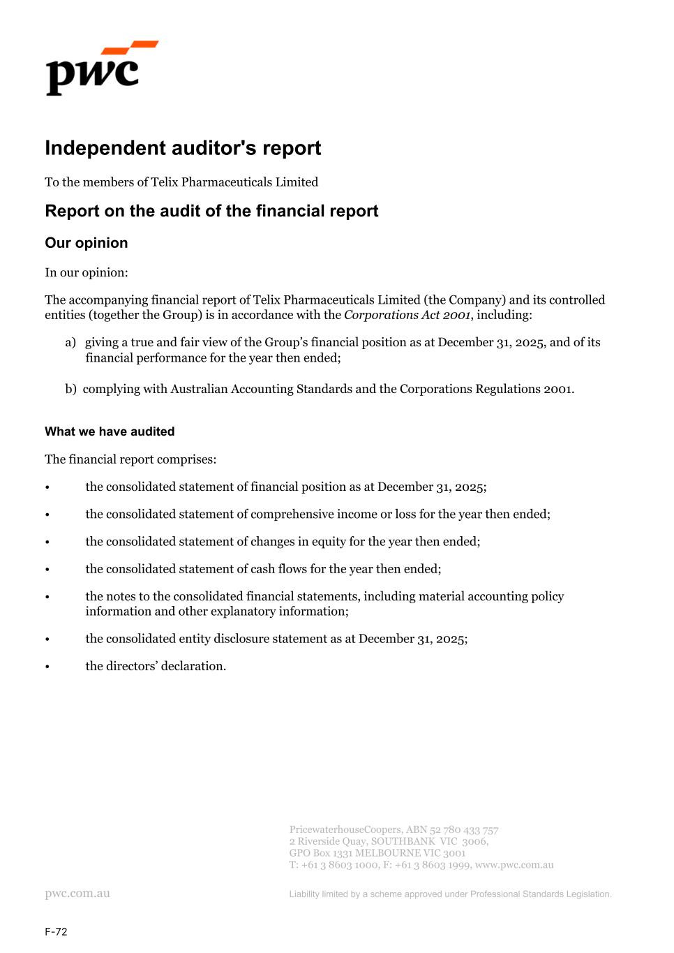 Independent auditor's report To the members of Telix Pharmaceuticals Limited Report on the audit of the financial report Our opinion In our opinion: The accompanying financial report of Telix Pharmaceuticals Limited (the Company) and its controlled entities (together the Group) is in accordance with the Corporations Act 2001, including: a) giving a true and fair view of the Group’s financial position as at December 31, 2025, and of its financial performance for the year then ended; b) complying with Australian Accounting Standards and the Corporations Regulations 2001. What we have audited The financial report comprises: • the consolidated statement of financial position as at December 31, 2025; • the consolidated statement of comprehensive income or loss for the year then ended; • the consolidated statement of changes in equity for the year then ended; • the consolidated statement of cash flows for the year then ended; • the notes to the consolidated financial statements, including material accounting policy information and other explanatory information; • the consolidated entity disclosure statement as at December 31, 2025; • the directors’ declaration. PricewaterhouseCoopers, ABN 52 780 433 757 2 Riverside Quay, SOUTHBANK VIC 3006, GPO Box 1331 MELBOURNE VIC 3001 T: +61 3 8603 1000, F: +61 3 8603 1999, www.pwc.com.au pwc.com.au Liability limited by a scheme approved under Professional Standards Legislation. F-72
