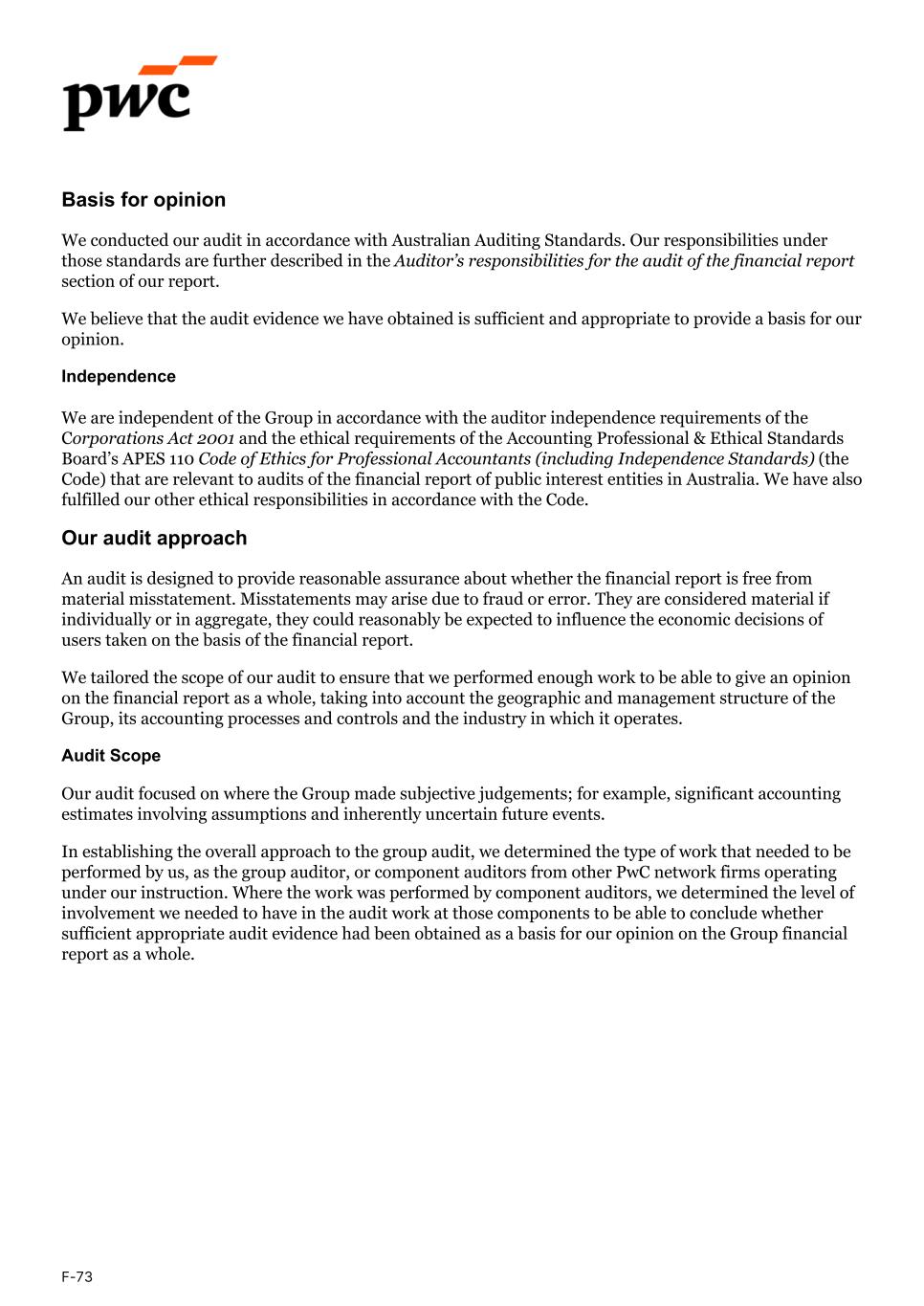 Basis for opinion We conducted our audit in accordance with Australian Auditing Standards. Our responsibilities under those standards are further described in the Auditor’s responsibilities for the audit of the financial report section of our report. We believe that the audit evidence we have obtained is sufficient and appropriate to provide a basis for our opinion. Independence We are independent of the Group in accordance with the auditor independence requirements of the Corporations Act 2001 and the ethical requirements of the Accounting Professional & Ethical Standards Board’s APES 110 Code of Ethics for Professional Accountants (including Independence Standards) (the Code) that are relevant to audits of the financial report of public interest entities in Australia. We have also fulfilled our other ethical responsibilities in accordance with the Code. Our audit approach An audit is designed to provide reasonable assurance about whether the financial report is free from material misstatement. Misstatements may arise due to fraud or error. They are considered material if individually or in aggregate, they could reasonably be expected to influence the economic decisions of users taken on the basis of the financial report. We tailored the scope of our audit to ensure that we performed enough work to be able to give an opinion on the financial report as a whole, taking into account the geographic and management structure of the Group, its accounting processes and controls and the industry in which it operates. Audit Scope Our audit focused on where the Group made subjective judgements; for example, significant accounting estimates involving assumptions and inherently uncertain future events. In establishing the overall approach to the group audit, we determined the type of work that needed to be performed by us, as the group auditor, or component auditors from other PwC network firms operating under our instruction. Where the work was performed by component auditors, we determined the level of involvement we needed to have in the audit work at those components to be able to conclude whether sufficient appropriate audit evidence had been obtained as a basis for our opinion on the Group financial report as a whole. F-73