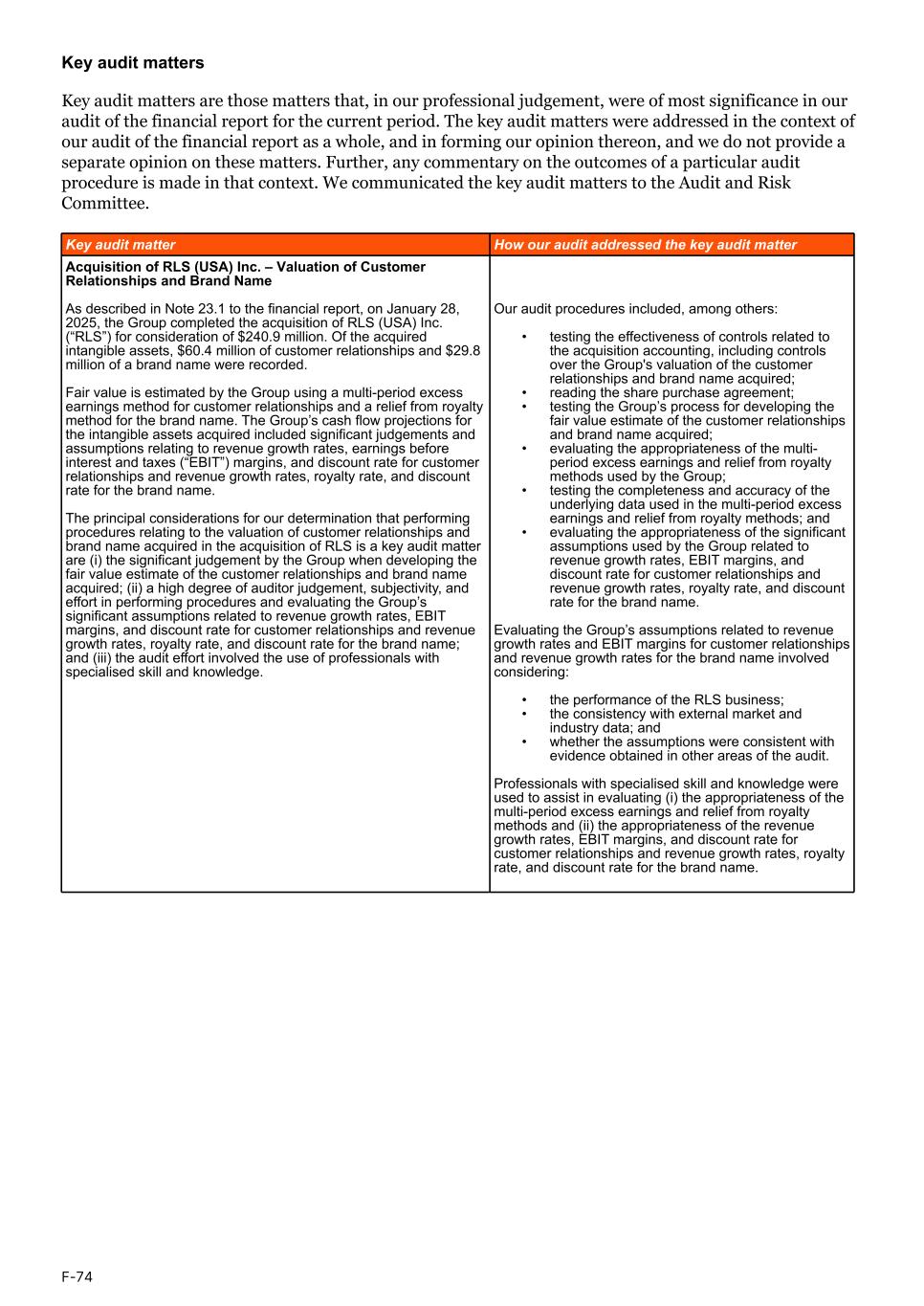 Key audit matters Key audit matters are those matters that, in our professional judgement, were of most significance in our audit of the financial report for the current period. The key audit matters were addressed in the context of our audit of the financial report as a whole, and in forming our opinion thereon, and we do not provide a separate opinion on these matters. Further, any commentary on the outcomes of a particular audit procedure is made in that context. We communicated the key audit matters to the Audit and Risk Committee. Acquisition of RLS (USA) Inc. – Valuation of Customer Relationships and Brand Name As described in Note 23.1 to the financial report, on January 28, 2025, the Group completed the acquisition of RLS (USA) Inc. (“RLS”) for consideration of $240.9 million. Of the acquired intangible assets, $60.4 million of customer relationships and $29.8 million of a brand name were recorded. Fair value is estimated by the Group using a multi-period excess earnings method for customer relationships and a relief from royalty method for the brand name. The Group’s cash flow projections for the intangible assets acquired included significant judgements and assumptions relating to revenue growth rates, earnings before interest and taxes (“EBIT”) margins, and discount rate for customer relationships and revenue growth rates, royalty rate, and discount rate for the brand name. The principal considerations for our determination that performing procedures relating to the valuation of customer relationships and brand name acquired in the acquisition of RLS is a key audit matter are (i) the significant judgement by the Group when developing the fair value estimate of the customer relationships and brand name acquired; (ii) a high degree of auditor judgement, subjectivity, and effort in performing procedures and evaluating the Group’s significant assumptions related to revenue growth rates, EBIT margins, and discount rate for customer relationships and revenue growth rates, royalty rate, and discount rate for the brand name; and (iii) the audit effort involved the use of professionals with specialised skill and knowledge. Our audit procedures included, among others: • testing the effectiveness of controls related to the acquisition accounting, including controls over the Group's valuation of the customer relationships and brand name acquired; • reading the share purchase agreement; • testing the Group’s process for developing the fair value estimate of the customer relationships and brand name acquired; • evaluating the appropriateness of the multi- period excess earnings and relief from royalty methods used by the Group; • testing the completeness and accuracy of the underlying data used in the multi-period excess earnings and relief from royalty methods; and • evaluating the appropriateness of the significant assumptions used by the Group related to revenue growth rates, EBIT margins, and discount rate for customer relationships and revenue growth rates, royalty rate, and discount rate for the brand name. Evaluating the Group’s assumptions related to revenue growth rates and EBIT margins for customer relationships and revenue growth rates for the brand name involved considering: • the performance of the RLS business; • the consistency with external market and industry data; and • whether the assumptions were consistent with evidence obtained in other areas of the audit. Professionals with specialised skill and knowledge were used to assist in evaluating (i) the appropriateness of the multi-period excess earnings and relief from royalty methods and (ii) the appropriateness of the revenue growth rates, EBIT margins, and discount rate for customer relationships and revenue growth rates, royalty rate, and discount rate for the brand name. Key audit matter How our audit addressed the key audit matter F-74