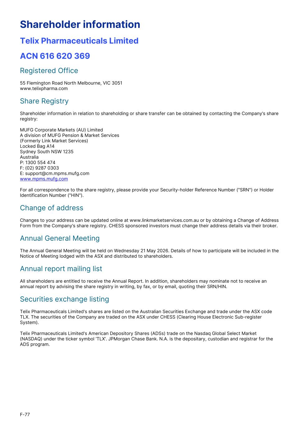 Shareholder information Telix Pharmaceuticals Limited ACN 616 620 369 Registered Office 55 Flemington Road North Melbourne, VIC 3051 www.telixpharma.com Share Registry Shareholder information in relation to shareholding or share transfer can be obtained by contacting the Company’s share registry: MUFG Corporate Markets (AU) Limited A division of MUFG Pension & Market Services (Formerly Link Market Services) Locked Bag A14 Sydney South NSW 1235 Australia P: 1300 554 474 F: (02) 9287 0303 E: support@cm.mpms.mufg.com www.mpms.mufg.com For all correspondence to the share registry, please provide your Security-holder Reference Number ("SRN") or Holder Identification Number ("HIN"). Change of address Changes to your address can be updated online at www.linkmarketservices.com.au or by obtaining a Change of Address Form from the Company’s share registry. CHESS sponsored investors must change their address details via their broker. Annual General Meeting The Annual General Meeting will be held on Wednesday 21 May 2026. Details of how to participate will be included in the Notice of Meeting lodged with the ASX and distributed to shareholders. Annual report mailing list All shareholders are entitled to receive the Annual Report. In addition, shareholders may nominate not to receive an annual report by advising the share registry in writing, by fax, or by email, quoting their SRN/HIN. Securities exchange listing Telix Pharmaceuticals Limited's shares are listed on the Australian Securities Exchange and trade under the ASX code TLX. The securities of the Company are traded on the ASX under CHESS (Clearing House Electronic Sub-register System). Telix Pharmaceuticals Limited's American Depository Shares (ADSs) trade on the Nasdaq Global Select Market (NASDAQ) under the ticker symbol ‘TLX’. JPMorgan Chase Bank. N.A. is the depositary, custodian and registrar for the ADS program. F-77
