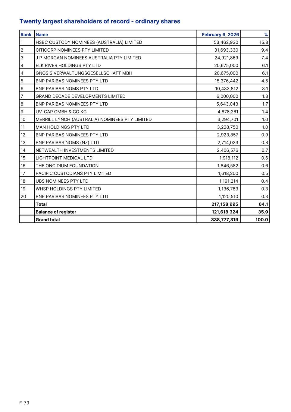 Twenty largest shareholders of record - ordinary shares Rank Name February 6, 2026 % 1 HSBC CUSTODY NOMINEES (AUSTRALIA) LIMITED 53,462,930 15.8 2 CITICORP NOMINEES PTY LIMITED 31,693,330 9.4 3 J P MORGAN NOMINEES AUSTRALIA PTY LIMITED 24,921,869 7.4 4 ELK RIVER HOLDINGS PTY LTD 20,675,000 6.1 4 GNOSIS VERWALTUNGSGESELLSCHAFT MBH 20,675,000 6.1 5 BNP PARIBAS NOMINEES PTY LTD 15,376,442 4.5 6 BNP PARIBAS NOMS PTY LTD 10,433,812 3.1 7 GRAND DECADE DEVELOPMENTS LIMITED 6,000,000 1.8 8 BNP PARIBAS NOMINEES PTY LTD 5,643,043 1.7 9 UV-CAP GMBH & CO KG 4,878,261 1.4 10 MERRILL LYNCH (AUSTRALIA) NOMINEES PTY LIMITED 3,294,701 1.0 11 MAN HOLDINGS PTY LTD 3,228,750 1.0 12 BNP PARIBAS NOMINEES PTY LTD 2,923,857 0.9 13 BNP PARIBAS NOMS (NZ) LTD 2,714,023 0.8 14 NETWEALTH INVESTMENTS LIMITED 2,406,576 0.7 15 LIGHTPOINT MEDICAL LTD 1,918,112 0.6 16 THE ONCIDIUM FOUNDATION 1,846,582 0.6 17 PACIFIC CUSTODIANS PTY LIMITED 1,618,200 0.5 18 UBS NOMINEES PTY LTD 1,191,214 0.4 19 WHSP HOLDINGS PTY LIMITED 1,136,783 0.3 20 BNP PARIBAS NOMINEES PTY LTD 1,120,510 0.3 Total 217,158,995 64.1 Balance of register 121,618,324 35.9 Grand total 338,777,319 100.0 F-79