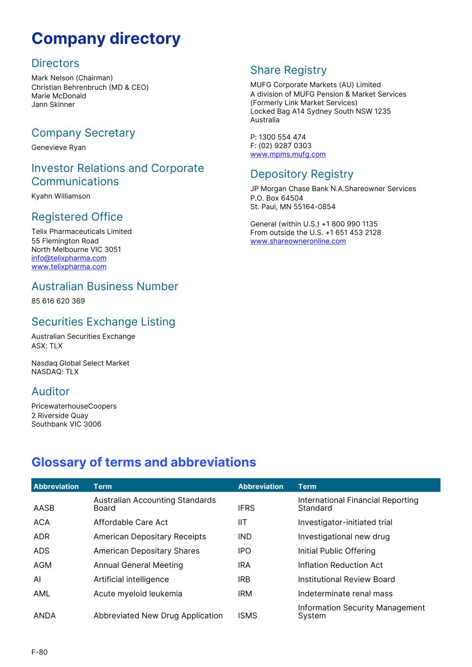 Company directory Directors Mark Nelson (Chairman) Christian Behrenbruch (MD & CEO) Marie McDonald Jann Skinner Company Secretary Genevieve Ryan Investor Relations and Corporate Communications Kyahn Williamson Registered Office Telix Pharmaceuticals Limited 55 Flemington Road North Melbourne VIC 3051 info@telixpharma.com www.telixpharma.com Australian Business Number 85 616 620 369 Securities Exchange Listing Australian Securities Exchange ASX: TLX Nasdaq Global Select Market NASDAQ: TLX Auditor PricewaterhouseCoopers 2 Riverside Quay Southbank VIC 3006 Share Registry MUFG Corporate Markets (AU) Limited A division of MUFG Pension & Market Services (Formerly Link Market Services) Locked Bag A14 Sydney South NSW 1235 Australia P: 1300 554 474 F: (02) 9287 0303 www.mpms.mufg.com Depository Registry JP Morgan Chase Bank N.A.Shareowner Services P.O. Box 64504 St. Paul, MN 55164-0854 General (within U.S.) +1 800 990 1135 From outside the U.S. +1 651 453 2128 www.shareowneronline.com Glossary of terms and abbreviations AASB Australian Accounting Standards Board IFRS International Financial Reporting Standard ACA Affordable Care Act IIT Investigator-initiated trial ADR American Depositary Receipts IND Investigational new drug ADS American Depositary Shares IPO Initial Public Offering AGM Annual General Meeting IRA Inflation Reduction Act AI Artificial intelligence IRB Institutional Review Board AML Acute myeloid leukemia IRM Indeterminate renal mass ANDA Abbreviated New Drug Application ISMS Information Security Management System Abbreviation Term Abbreviation Term F-80