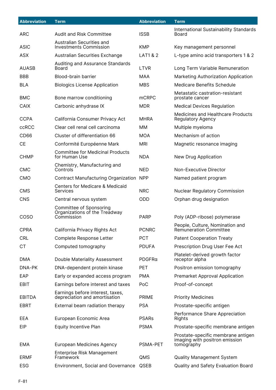 ARC Audit and Risk Committee ISSB International Sustainability Standards Board ASIC Australian Securities and Investments Commission KMP Key management personnel ASX Australian Securities Exchange LAT1 & 2 L-type amino acid transporters 1 & 2 AUASB Auditing and Assurance Standards Board LTVR Long Term Variable Remuneration BBB Blood-brain barrier MAA Marketing Authorization Application BLA Biologics License Application MBS Medicare Benefits Schedule BMC Bone marrow conditioning mCRPC Metastatic castration-resistant prostate cancer CAIX Carbonic anhydrase IX MDR Medical Devices Regulation CCPA California Consumer Privacy Act MHRA Medicines and Healthcare Products Regulatory Agency ccRCC Clear cell renal cell carcinoma MM Multiple myeloma CD66 Cluster of differentiation 66 MOA Mechanism of action CE Conformité Européenne Mark MRI Magnetic resonance imaging CHMP Committee for Medicinal Products for Human Use NDA New Drug Application CMC Chemistry, Manufacturing and Controls NED Non-Executive Director CMO Contract Manufacturing Organization NPP Named patient program CMS Centers for Medicare & Medicaid Services NRC Nuclear Regulatory Commission CNS Central nervous system ODD Orphan drug designation COSO Committee of Sponsoring Organizations of the Treadway Commission PARP Poly (ADP-ribose) polymerase CPRA California Privacy Rights Act PCNRC People, Culture, Nomination and Remuneration Committee CRL Complete Response Letter PCT Patent Cooperation Treaty CT Computed tomography PDUFA Prescription Drug User Fee Act DMA Double Materiality Assessment PDGFRα Platelet-derived growth factor receptor alpha DNA-PK DNA-dependent protein kinase PET Positron emission tomography EAP Early or expanded access program PMA Premarket Approval Application EBIT Earnings before interest and taxes PoC Proof-of-concept EBITDA Earnings before interest, taxes, depreciation and amortisation PRIME Priority Medicines EBRT External beam radiation therapy PSA Prostate-specific antigen EEA European Economic Area PSARs Performance Share Appreciation Rights EIP Equity Incentive Plan PSMA Prostate-specific membrane antigen EMA European Medicines Agency PSMA-PET Prostate-specific membrane antigen imaging with positron emission tomography ERMF Enterprise Risk Management Framework QMS Quality Management System ESG Environment, Social and Governance QSEB Quality and Safety Evaluation Board Abbreviation Term Abbreviation Term F-81