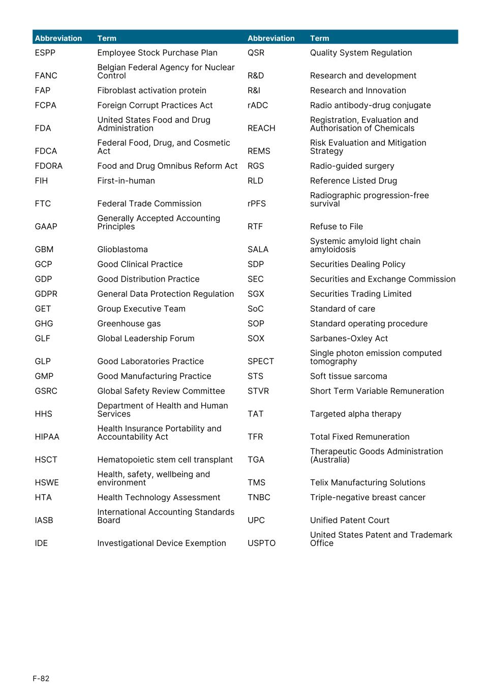 ESPP Employee Stock Purchase Plan QSR Quality System Regulation FANC Belgian Federal Agency for Nuclear Control R&D Research and development FAP Fibroblast activation protein R&I Research and Innovation FCPA Foreign Corrupt Practices Act rADC Radio antibody-drug conjugate FDA United States Food and Drug Administration REACH Registration, Evaluation and Authorisation of Chemicals FDCA Federal Food, Drug, and Cosmetic Act REMS Risk Evaluation and Mitigation Strategy FDORA Food and Drug Omnibus Reform Act RGS Radio-guided surgery FIH First-in-human RLD Reference Listed Drug FTC Federal Trade Commission rPFS Radiographic progression-free survival GAAP Generally Accepted Accounting Principles RTF Refuse to File GBM Glioblastoma SALA Systemic amyloid light chain amyloidosis GCP Good Clinical Practice SDP Securities Dealing Policy GDP Good Distribution Practice SEC Securities and Exchange Commission GDPR General Data Protection Regulation SGX Securities Trading Limited GET Group Executive Team SoC Standard of care GHG Greenhouse gas SOP Standard operating procedure GLF Global Leadership Forum SOX Sarbanes-Oxley Act GLP Good Laboratories Practice SPECT Single photon emission computed tomography GMP Good Manufacturing Practice STS Soft tissue sarcoma GSRC Global Safety Review Committee STVR Short Term Variable Remuneration HHS Department of Health and Human Services TAT Targeted alpha therapy HIPAA Health Insurance Portability and Accountability Act TFR Total Fixed Remuneration HSCT Hematopoietic stem cell transplant TGA Therapeutic Goods Administration (Australia) HSWE Health, safety, wellbeing and environment TMS Telix Manufacturing Solutions HTA Health Technology Assessment TNBC Triple-negative breast cancer IASB International Accounting Standards Board UPC Unified Patent Court IDE Investigational Device Exemption USPTO United States Patent and Trademark Office Abbreviation Term Abbreviation Term F-82