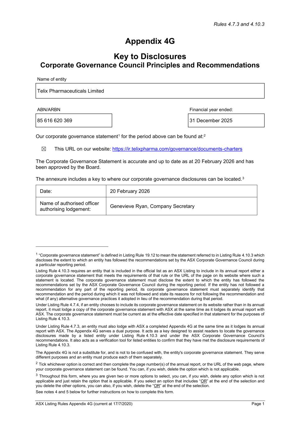 Rules 4.7.3 and 4.10.3 ASX Listing Rules Appendix 4G (current at 17/7/2020) Page 1 Appendix 4G Key to Disclosures Corporate Governance Council Principles and Recommendations Name of entity Telix Pharmaceuticals Limited ABN/ARBN Financial year ended: 85 616 620 369 31 December 2025 Our corporate governance statement1 for the period above can be found at:2 ☒ This URL on our website: https://ir.telixpharma.com/governance/documents-charters The Corporate Governance Statement is accurate and up to date as at 20 February 2026 and has been approved by the Board. The annexure includes a key to where our corporate governance disclosures can be located.3 Date: 20 February 2026 Name of authorised officer authorising lodgement: Genevieve Ryan, Company Secretary 1 “Corporate governance statement” is defined in Listing Rule 19.12 to mean the statement referred to in Listing Rule 4.10.3 which discloses the extent to which an entity has followed the recommendations set by the ASX Corporate Governance Council during a particular reporting period. Listing Rule 4.10.3 requires an entity that is included in the official list as an ASX Listing to include in its annual report either a corporate governance statement that meets the requirements of that rule or the URL of the page on its website where such a statement is located. The corporate governance statement must disclose the extent to which the entity has followed the recommendations set by the ASX Corporate Governance Council during the reporting period. If the entity has not followed a recommendation for any part of the reporting period, its corporate governance statement must separately identify that recommendation and the period during which it was not followed and state its reasons for not following the recommendation and what (if any) alternative governance practices it adopted in lieu of the recommendation during that period. Under Listing Rule 4.7.4, if an entity chooses to include its corporate governance statement on its website rather than in its annual report, it must lodge a copy of the corporate governance statement with ASX at the same time as it lodges its annual report with ASX. The corporate governance statement must be current as at the effective date specified in that statement for the purposes of Listing Rule 4.10.3. Under Listing Rule 4.7.3, an entity must also lodge with ASX a completed Appendix 4G at the same time as it lodges its annual report with ASX. The Appendix 4G serves a dual purpose. It acts as a key designed to assist readers to locate the governance disclosures made by a listed entity under Listing Rule 4.10.3 and under the ASX Corporate Governance Council’s recommendations. It also acts as a verification tool for listed entities to confirm that they have met the disclosure requirements of Listing Rule 4.10.3. The Appendix 4G is not a substitute for, and is not to be confused with, the entity's corporate governance statement. They serve different purposes and an entity must produce each of them separately. 2 Tick whichever option is correct and then complete the page number(s) of the annual report, or the URL of the web page, where your corporate governance statement can be found. You can, if you wish, delete the option which is not applicable. 3 Throughout this form, where you are given two or more options to select, you can, if you wish, delete any option which is not applicable and just retain the option that is applicable. If you select an option that includes “OR” at the end of the selection and you delete the other options, you can also, if you wish, delete the “OR” at the end of the selection. See notes 4 and 5 below for further instructions on how to complete this form.