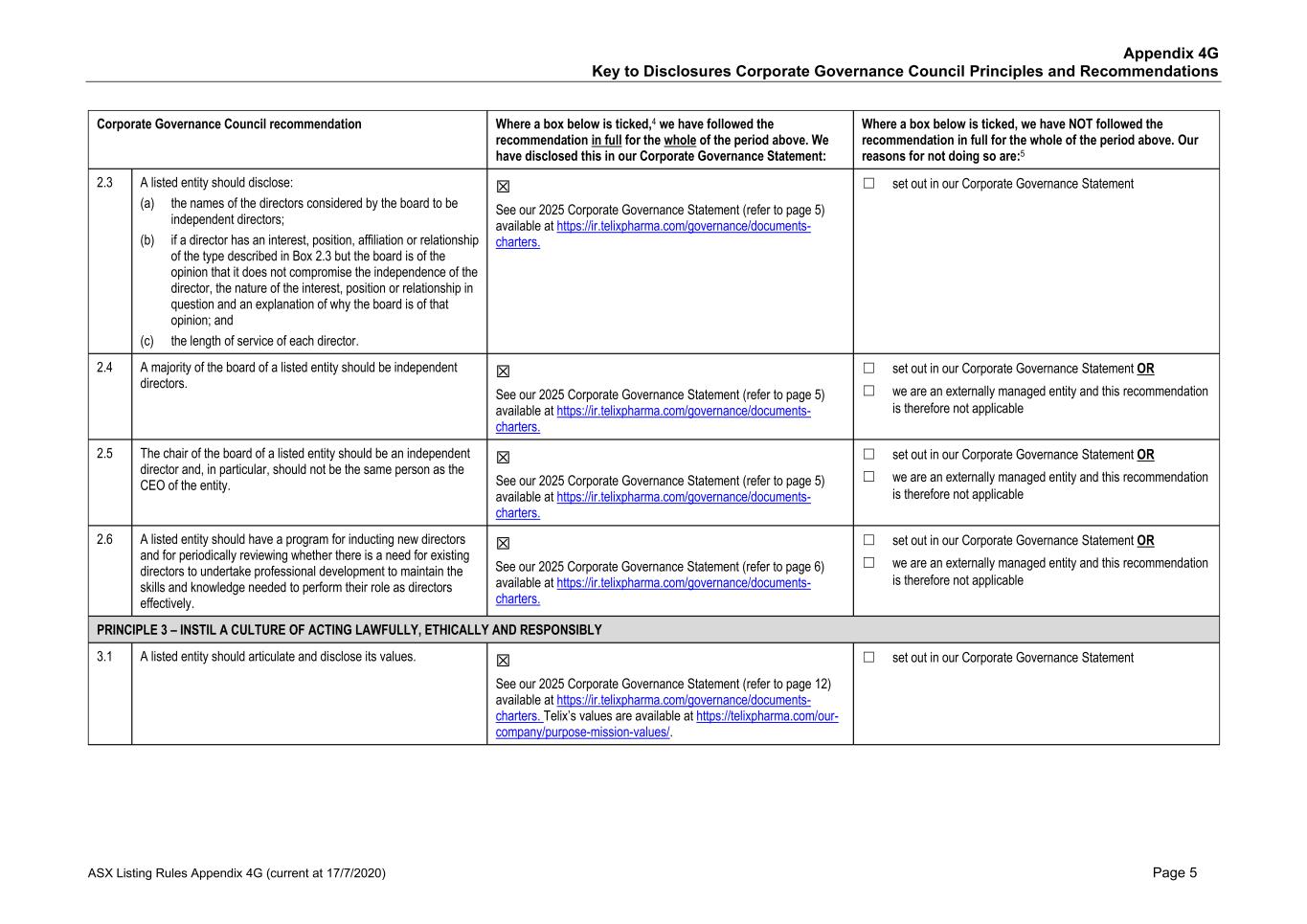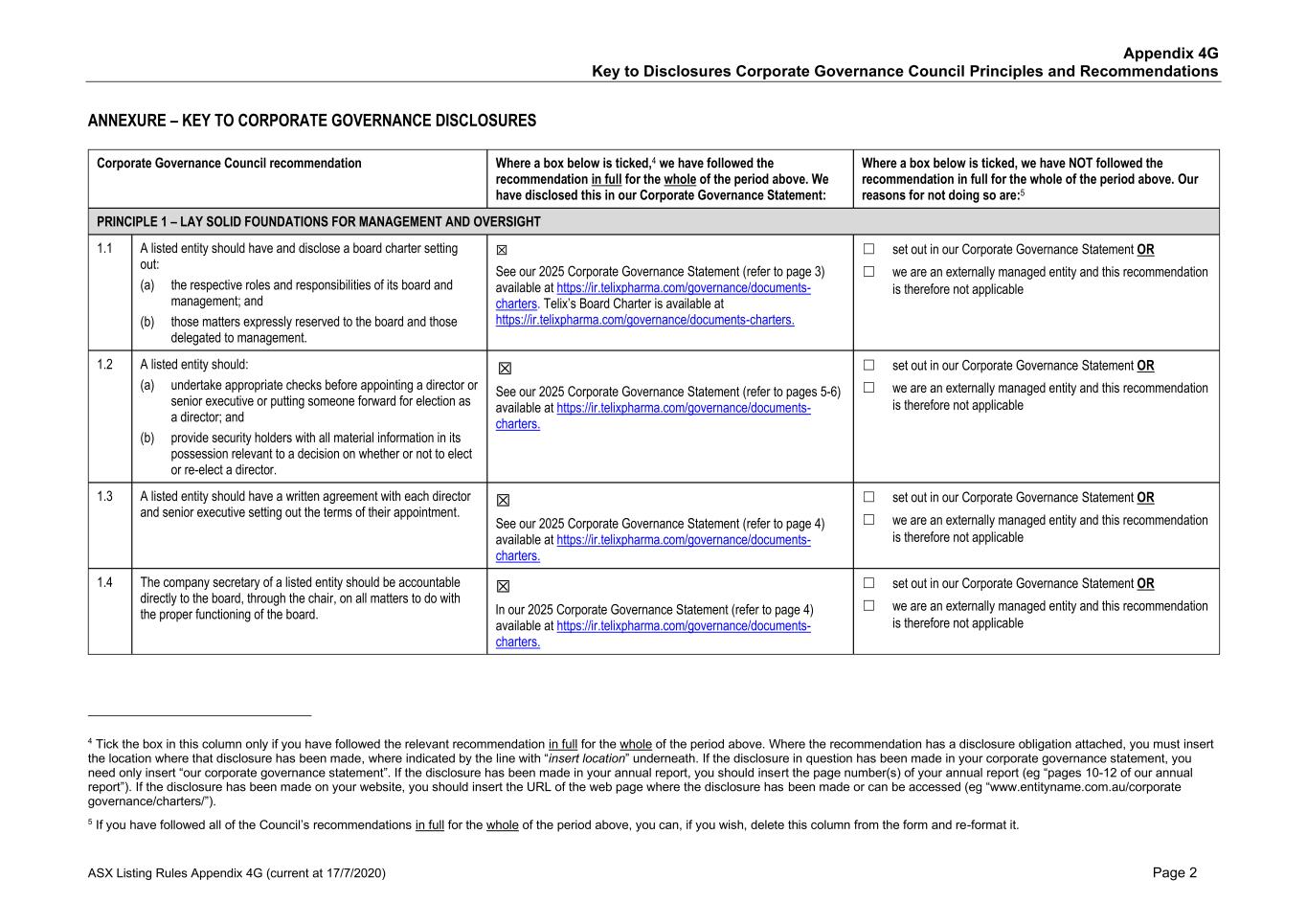 Appendix 4G Key to Disclosures Corporate Governance Council Principles and Recommendations ASX Listing Rules Appendix 4G (current at 17/7/2020) Page 5 Corporate Governance Council recommendation Where a box below is ticked,4 we have followed the recommendation in full for the whole of the period above. We have disclosed this in our Corporate Governance Statement: Where a box below is ticked, we have NOT followed the recommendation in full for the whole of the period above. Our reasons for not doing so are:5 2.3 A listed entity should disclose: (a) the names of the directors considered by the board to be independent directors; (b) if a director has an interest, position, affiliation or relationship of the type described in Box 2.3 but the board is of the opinion that it does not compromise the independence of the director, the nature of the interest, position or relationship in question and an explanation of why the board is of that opinion; and (c) the length of service of each director. ☒ See our 2025 Corporate Governance Statement (refer to page 5) available at https://ir.telixpharma.com/governance/documents- charters. ☐ set out in our Corporate Governance Statement 2.4 A majority of the board of a listed entity should be independent directors. ☒ See our 2025 Corporate Governance Statement (refer to page 5) available at https://ir.telixpharma.com/governance/documents- charters. ☐ set out in our Corporate Governance Statement OR ☐ we are an externally managed entity and this recommendation is therefore not applicable 2.5 The chair of the board of a listed entity should be an independent director and, in particular, should not be the same person as the CEO of the entity. ☒ See our 2025 Corporate Governance Statement (refer to page 5) available at https://ir.telixpharma.com/governance/documents- charters. ☐ set out in our Corporate Governance Statement OR ☐ we are an externally managed entity and this recommendation is therefore not applicable 2.6 A listed entity should have a program for inducting new directors and for periodically reviewing whether there is a need for existing directors to undertake professional development to maintain the skills and knowledge needed to perform their role as directors effectively. ☒ See our 2025 Corporate Governance Statement (refer to page 6) available at https://ir.telixpharma.com/governance/documents- charters. ☐ set out in our Corporate Governance Statement OR ☐ we are an externally managed entity and this recommendation is therefore not applicable PRINCIPLE 3 – INSTIL A CULTURE OF ACTING LAWFULLY, ETHICALLY AND RESPONSIBLY 3.1 A listed entity should articulate and disclose its values. ☒ See our 2025 Corporate Governance Statement (refer to page 12) available at https://ir.telixpharma.com/governance/documents- charters. Telix’s values are available at https://telixpharma.com/our- company/purpose-mission-values/. ☐ set out in our Corporate Governance Statement